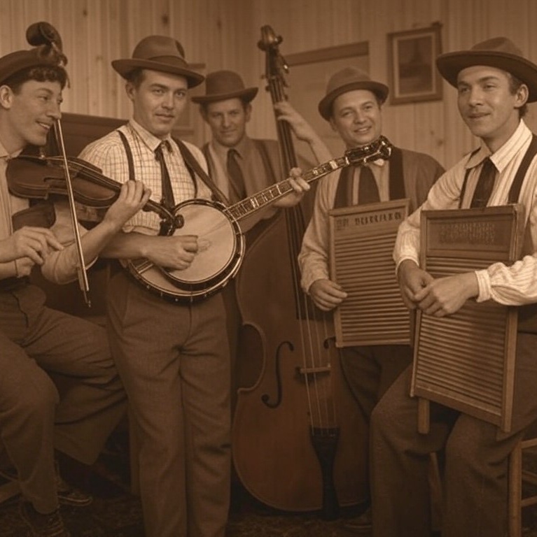 fast-paced bluegrass, galloping rhythm, dramatic fiddle harmonies, banjo rolls, upright bass walking lines, cinematic folk energy