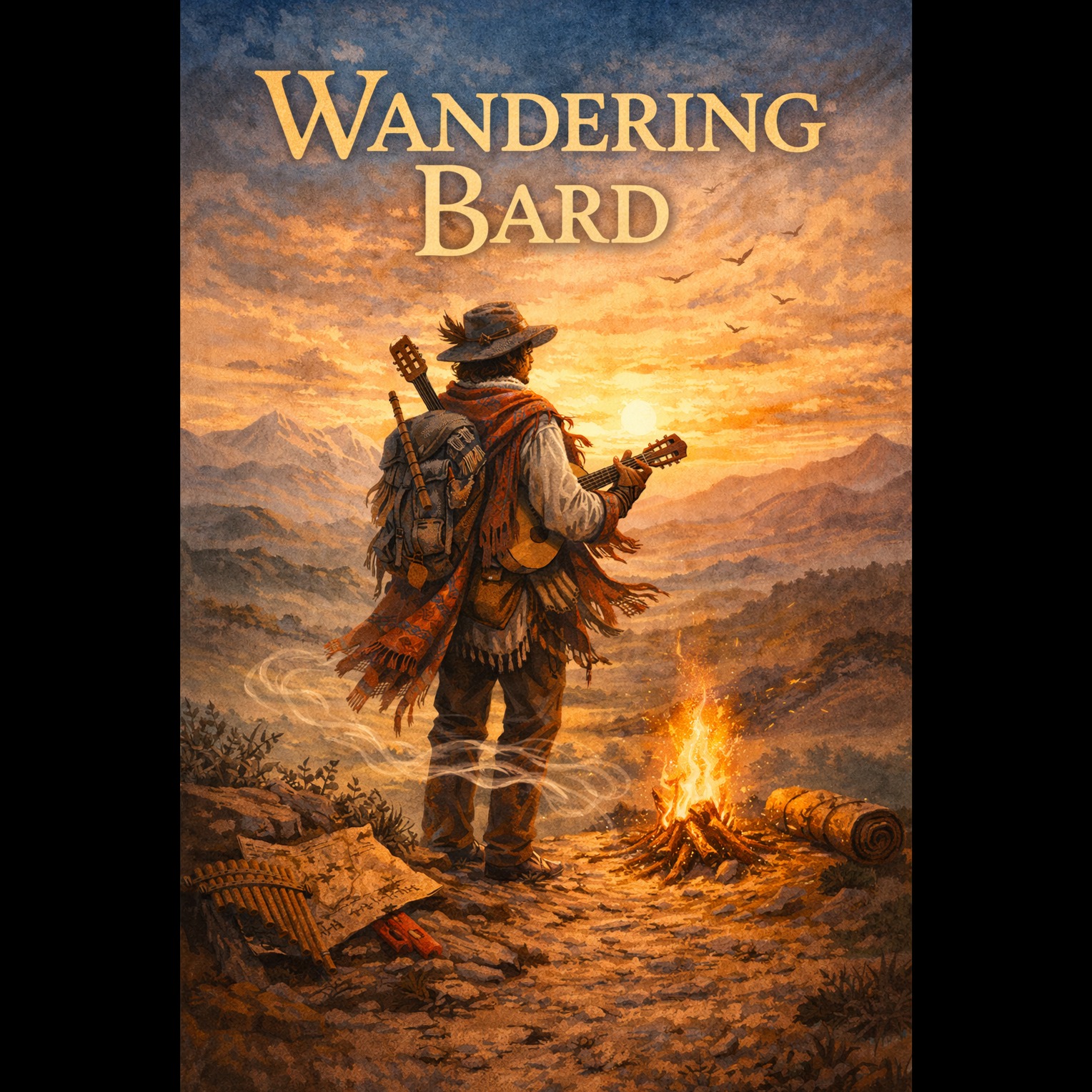 Style: folklore + flamenco fusion, world acoustic, traveling bard, warm airy male vocal