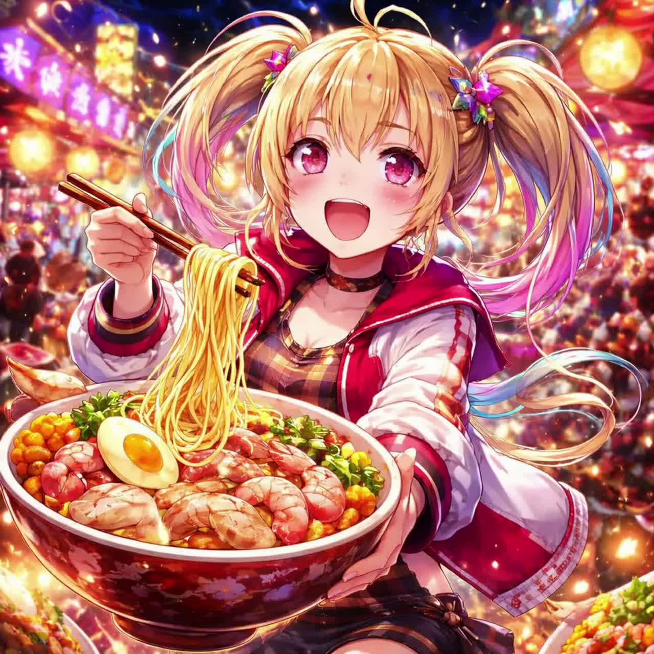 A neon noodle rally at 176 BPM: one tiny, razor-bright young voice sprinting through steam and sparkle, turning bowls into fireworks, Japanese kicks the door in with a chanty hook, then the track world-tours in short bursts—Korean bite, English swagger, Mandarin glow, Italian flourish, French mischief, Russian thunder—each stop leaving a quick shout to pass the mic, The beat stays tight and reckless, sugar-rush synths over sub bass, with playful slurp clicks and regional instrument flashes like street signs in motion, Funny, fast, and oddly primal—hunger as celebration, ultra high-pitched young female vocal, consistent female vocal throughout