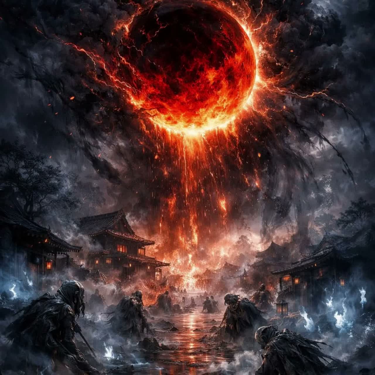 J-Rock and Epic Japanese cinematic metal fusion featuring aggressive heavy distorted down tuning guitars riffs, Heavy and Aggressive drumming, and soaring aggressive powerful male vocals, The track opens with a technical guitar solo utilizing pinch harmonics and fast alternate picking over a driving 4/4 beat at approximately 140 BPM, The chord progression follows a minor-key epic structure, utilizing power chords and palm-muted rhythmic patterns, The vocals are powerful and Aggressive, Baritone, characterized by a low range, occasional grit, and sustained high notes during the chorus, Production is polished with a wide stereo field, crisp drum transients, and layered vocal harmonies, Synthesizer pads provide a cinematic backdrop during the bridge, while the bass guitar maintains a tight, distorted low-end presence throughout, Female Vocal — High tone, soaling melody, well vocal, emotional