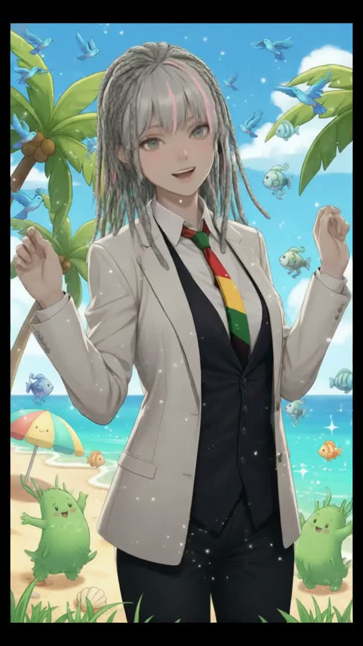 Bouncy island-reggae groove with syncopated offbeat skanks, warm sub-bass, and playful percussion; female vocals bright and nimble with stacked call-and-response hooks in the chorus, Verses stay breezy and narrative; chorus explodes with chant-like repetition and group shouts, Light synth pads and glockenspiel-style bells add fantasy sparkle, with a short breakdown where drums thin out and vocal ad-libs dance on top