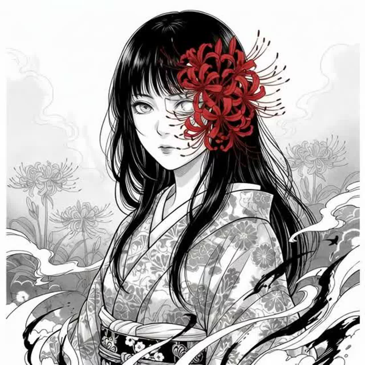 A black-haired girl with a blind left eye stands alone in a field of blooming red spider lilies, She sings for the one who will never return, her single eye capturing a world filled with sorrow, The crimson flowers sway like flames of longing, while an unextinguished light flickers in her closed eye, Tears fall into the river as her voice rises to the night sky, Her singing includes delicate kobushi and emotional ornamentation, emphasizing the deep sorrow and longing in her heart, Though bound by fate, she walks the path of spider lilies, carrying both grief and love within her heart, Note: This track is designed to evolve fluidly with Suno’s extend feature, allowing the story and atmosphere to transform seamlessly