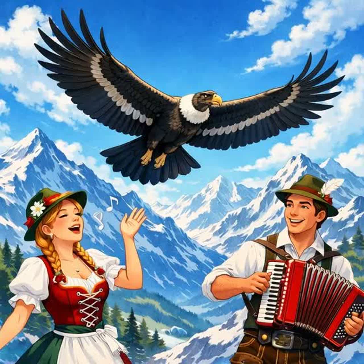 Create a vibrant and uplifting fusion track that blends traditional Alpine yodeling vocals with authentic Andean folk music, featuring charango, pan flute, quena, bombo legüero percussion, acoustic guitar, and lively rhythmic handclaps, combined with bright accordion harmonies and energetic polka-inspired bounce, shifting between fast celebratory dance sections and majestic mountain-echo yodel calls, layered with natural reverb as if performed between the Swiss Alps and the Andes Mountains, creating a festive cross-cultural soundscape full of joy, altitude, wind, echo, and world-folk energy, with dynamic tempo changes, call-and-response vocals, rich acoustic textures, cinematic build-ups, and a triumphant final chorus that feels like a sunrise over two continents
