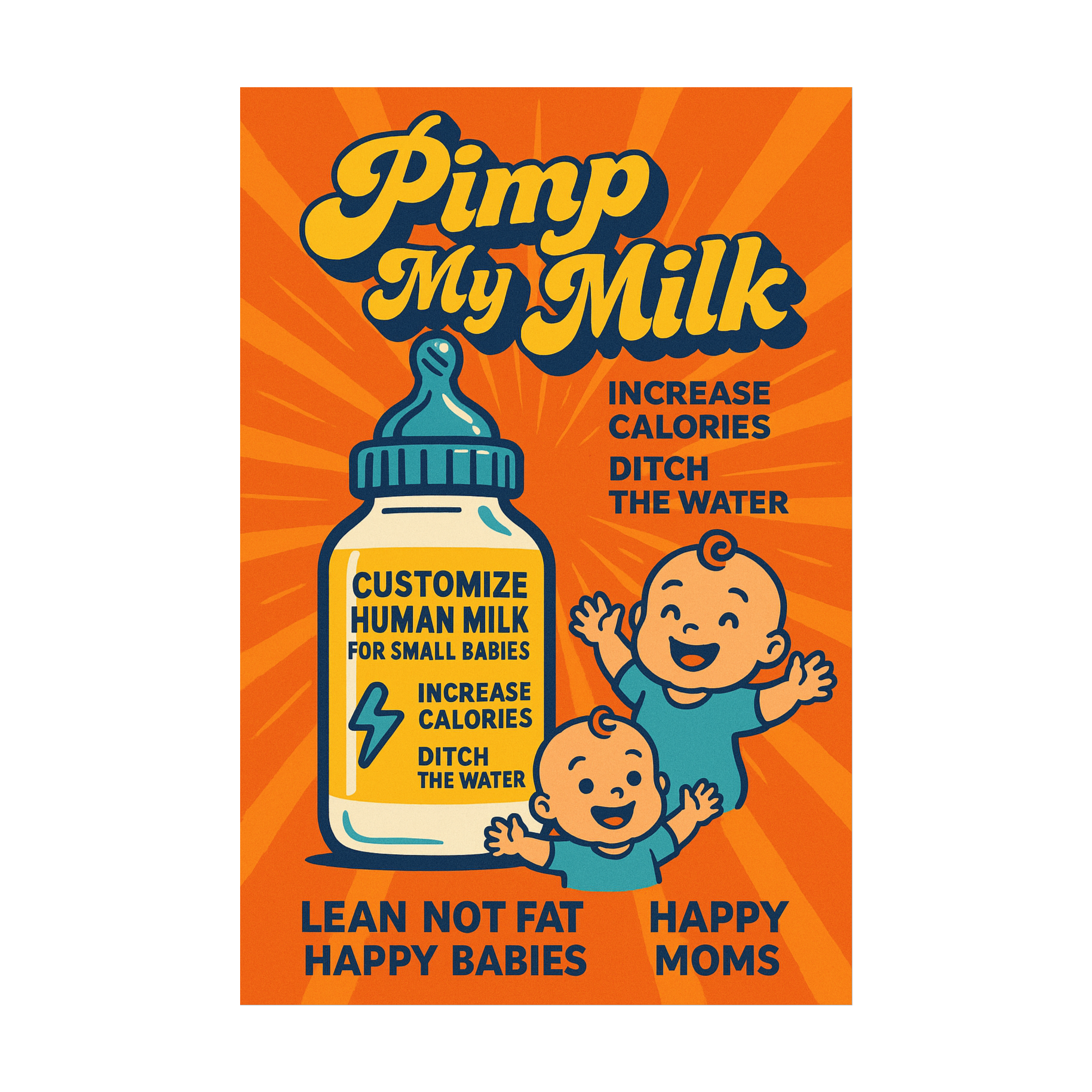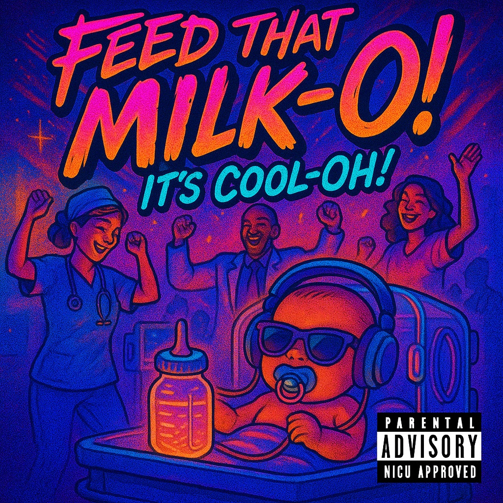 Style: Fun, high‑energy party rap with swaggering bass, playful horns, and a club‑ready bounce, Mood: Cheeky, celebratory, confident, Vocal Delivery: Rap verses with hype ad‑libs, call‑and‑response chants in the hook, Lyrics Theme: A tongue‑in‑cheek anthem about customizing baby milk—boosting calories, cutting water, growing strong lean babies, Emphasize “Happy babies, happy moms” as the feel‑good payoff, Hook Example: “Pimp my milk, make it thick, make it strong / Calories up, water gone, lean all along / Grow the babies, watch ’em flex, sing along / Happy babies, happy moms, party all night long!”