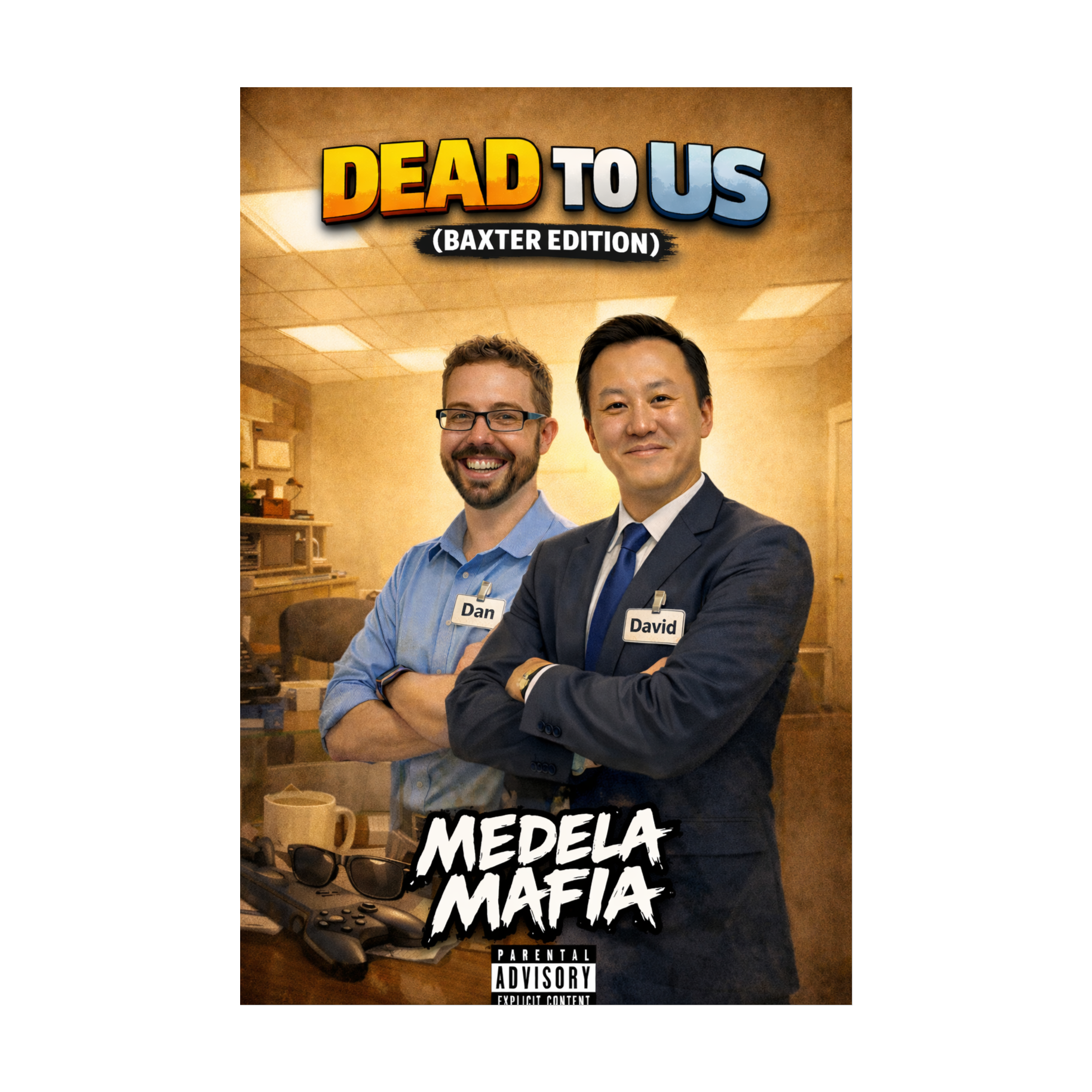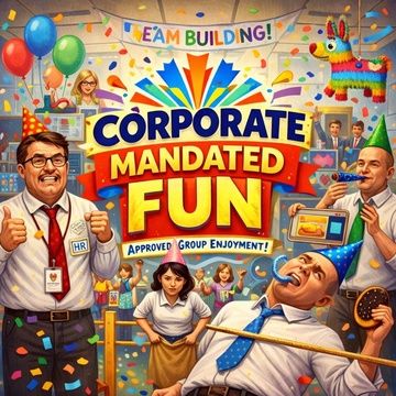 Hip-hop beat with clunky handclaps, sterile synths, and over-enthusiastic ad-libs like “Sign it!”, “Initial here!”, “Where’s the cake?!”, Channel the sadness of a corporate “celebration” with fluorescent lighting and zero snacks, Tone: ironic, weary, but funky