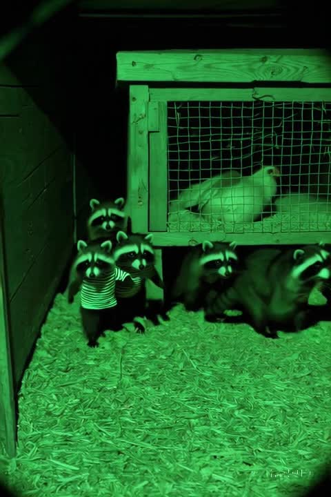 A whisper-style gangsta rap about raccoons attacking chickens at night and a farmer plotting silent revenge, Gritty trap beat with dark ambient tones, minimal instrumentation, and heavy sub-bass, Whispered and low-spoken vocals with intense delivery, Sounds of night, forest ambience, and distant clucking add texture, Think Wu-Tang meets horror movie