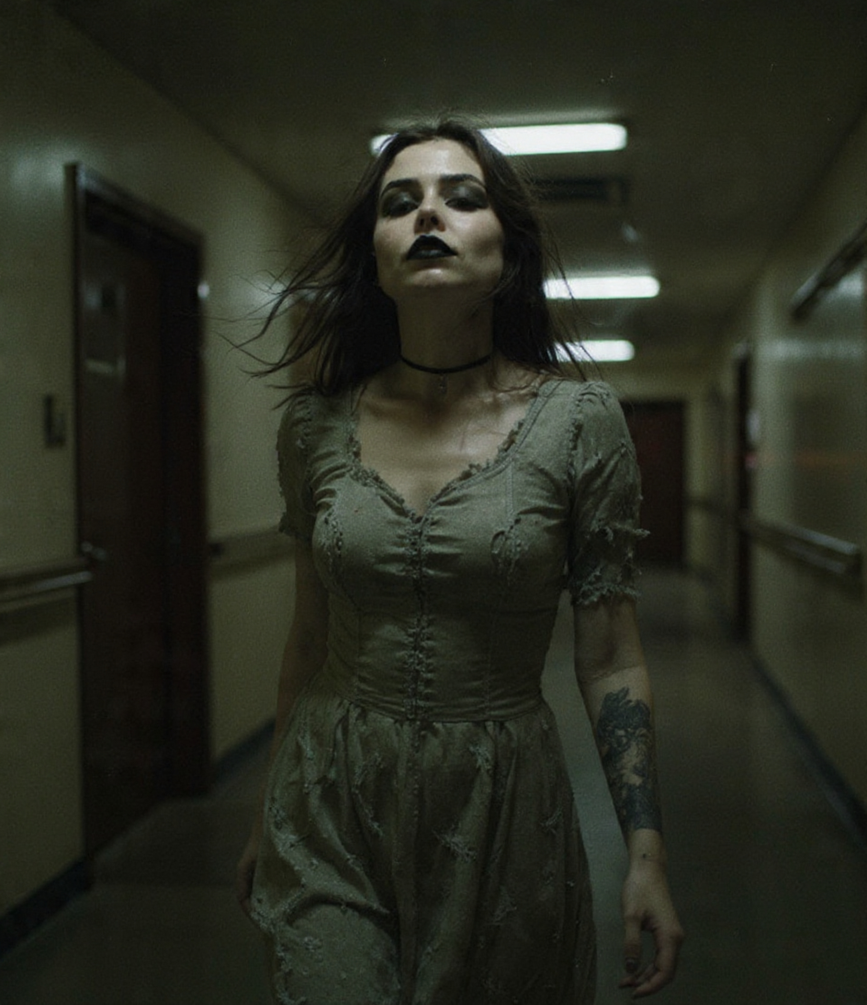 Heavy dark cinematic track with dark female vocals, Mid-tempo, minor key, oppressive atmosphere, Intro: spoken female voice, close-mic, dry, intimate, Verses: dark whispered female vocals, low register, layered, eerie, Chorus: restrained and ominous, whispered power, no uplift, tension sustained, Rap section: female rap, controlled aggression, sharp rhythmic delivery, not shouted, Instrumentation: deep sub bass, distorted low piano, cinematic drums, gritty synth textures, Guitars: emotional lead guitar solo before bridge, slow bends, wide reverb; guitar continues under bridge and final chorus, Final chorus: slightly expanded dynamics but remains dark and heavy, Mix: wide stereo, heavy low end, vocals forward, cinematic depth