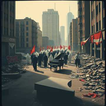 A three-act punk-rock epic opens with a vast, lonely grand piano soaked in hall reverb, deep marching snares, and perfectly separated instruments; vocals grow from whispered intimacy to intensity over melodic and dirty trio guitars, Act II erupts with stadium-scale punk: anthemic choruses, wide double-tracked vocals, soaring lead lines, gang shouts, and bullhorn drama, all automation-ridden for vocal impact—honky-tonk piano interjects sarcastically, with synthy, melodramatic strings and brass for extra flair, Act III explodes into furious double-time punk with gnashing guitars, frantic drums, and collapses to a gritty, broken piano, now tight and unforgiving