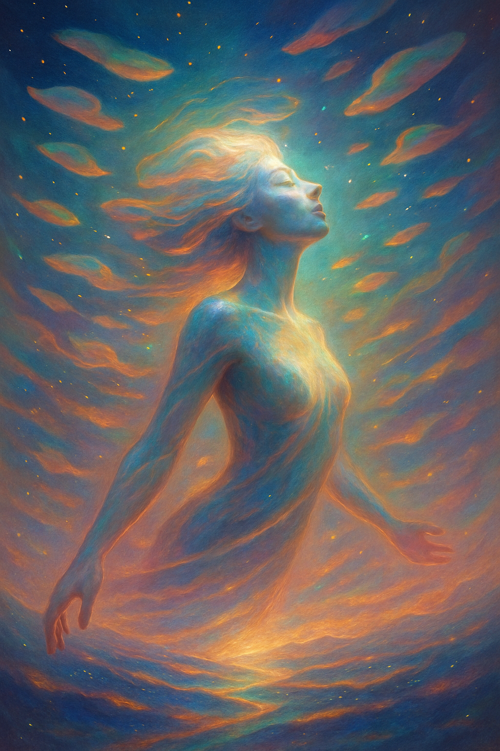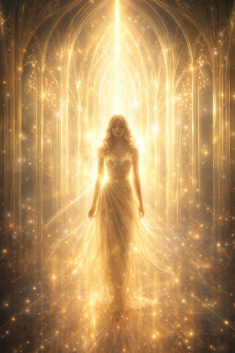 Ethereal Art Pop + Celestial Ambient Symphony | 70 BPM slow float | Harp-like synthesizer plucks refracting like prisms, glass chimes shimmering, and long-bowed orchestral strings swelling in tidal waves | No heavy drums, only micro-ticking percussive pulses resembling softened heartbeats and melting clocks | Massive cathedral-scale reverb creating infinite vertical space | Warm major-key radiance, bioluminescent tonal palette, sound like light passing through crystal | Vocals soaring yet intimate, operatic phrasing with stacked harmonies forming a luminous wall-of-angels effect | Production translucent, reverent, weightless, immersive, and spatially vast | Instrumental passages shimmer with glass harmonics while strings cascade in slow-motion orchestral blooms | Dynamic range emphasizes quiet-to-radiant swells | Timeless, sacred atmosphere