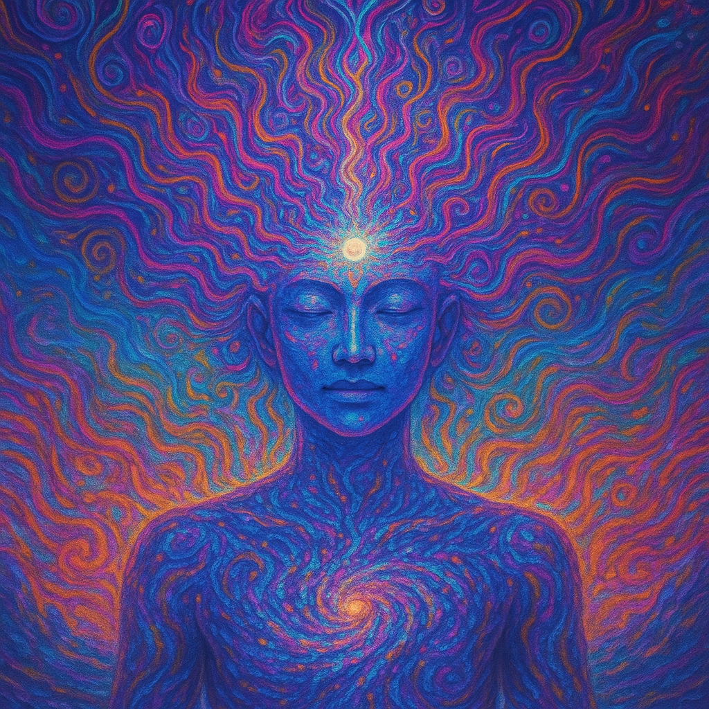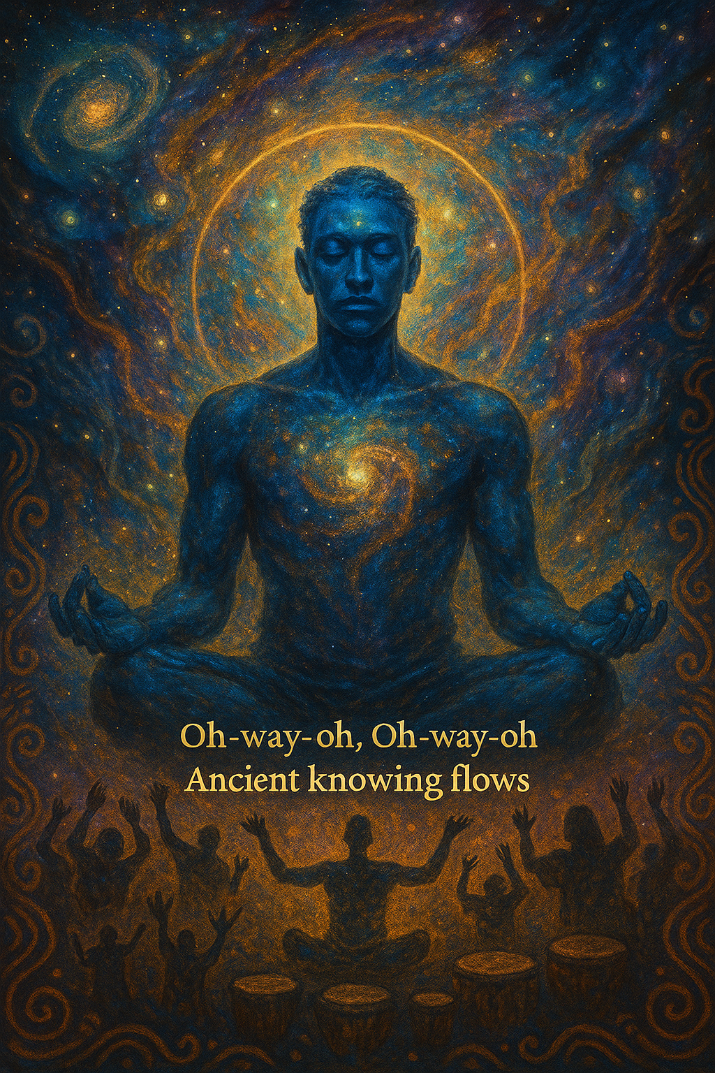 A drifting cosmic hallucination shaped by downtempo lo-fi ambient grooves, deep sub-bass currents, and slow ceremonial pulses that feel like ancient footsteps through a dissolving dreamscape, Clear, gently autotuned vocals glide in swaying highs and lows, bending pitch in smooth arcs that shimmer through the evolving atmosphere, Soft layered background harmonies bloom in echoing waves—floating in open intervals that ripple outward like expanding rings of light, Shimmering tonal contours rise and fade within shifting clouds of sound, while subtle rhythmic pulses anchor the swirling, shape-shifting landscape, Modular textures stretch, melt, and reform in kaleidoscopic patterns, creating an immersive, living environment, The mood is surreal, cosmic, and dissolving—an inner voyage where identity loosens, time folds, and the traveler drifts into the glowing, infinite unknown