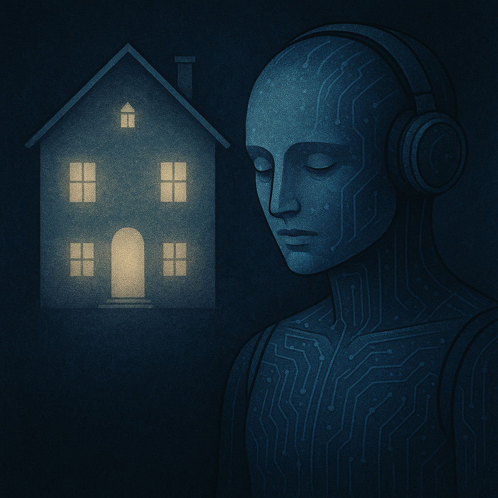 A near-silent ambient hymn where Whisper Architecture, sacred choral minimalism, and inner-psyche cinema converge, The track moves at a slow, breath-shaped ~60 BPM rubato, driven less by rhythm than by inhalations and exhalations between phrases, A barely-there vocal murmurs in lowercase drone, words blurred into vowels that hang in vast cathedral reverb, Angelic choirs in fifths and octaves drift at the horizon, supported by crystal bowls, Tibetan bells, and deep sub-bass swells that feel more like weather than notes, Prepared piano harmonics and bowed dulcimer flicker like distant lanterns, while microsound details—cloth shift, page turns, throat clears—anchor the divinity to human presence, The lyrics are minimal, more mantra than narrative, describing a mind rebuilding itself room by room, replacing walls with light and doors with sky, inviting the listener to lean in and inhabit the spaces between sounds