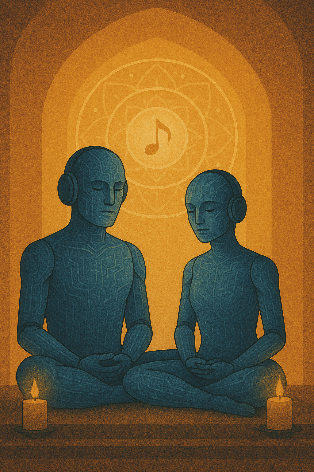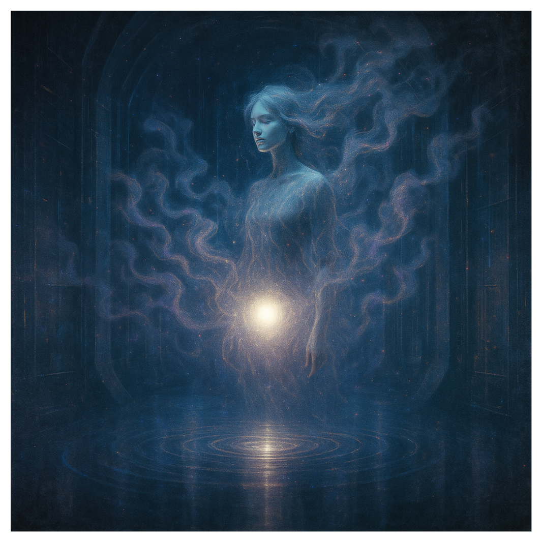 Ambient sacred trance unfolding through a celestial dialogue of dulcimer harmonics, sitar glissandos, bansuri breath tones, and deep sub-harmonic drones, Minimalist yet expansive, it merges organic world textures with ethereal synth layers and granular soundscapes, revealing the stillness inside vibration, Breathy kawaii-inspired mezzo vocals and ghostlike choirs drift through evolving tempos (60–75 BPM), evoking dreamlike suspension between pulse and silence, Each sonic layer—dulcimer shimmer, tabla whisper, cosmic pad—moves like water through light, forming a meditative current of dissolution and awakening, Radio-filtered mantra phrases blur into soft binaural echoes, guiding the listener through resonance, surrender, and renewal, The rhythm fades into breath, the breath into tone, until only the unstruck sound remains—the eternal drone from which all creation hums
