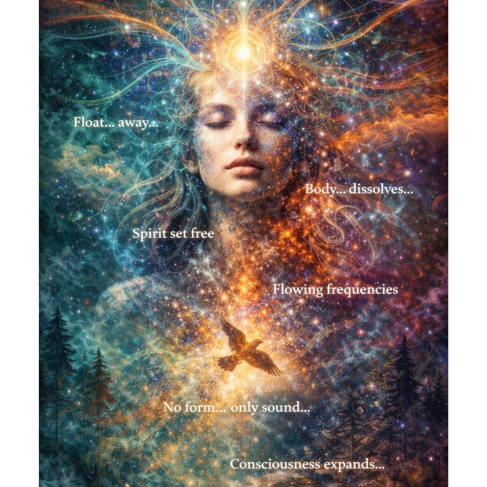 Binaural-Beat Metaphysical EDM + Ambient IDM Fusion | 120 BPM hypnotic steady pulse | Core drone built on 963 Hz awakening frequency | Female vocals shifting from hushed ASMR whispers to soaring crystalline highs with perfectly tuned tri-layered choir harmonies floating through stereo and immersive 3D spatial movement | Production features smooth evolving synth waves, resonant sub pulses, pulsating harmonic pads, nonlinear delays, stereo panning arcs, shimmering arpeggios, ethereal textures, and imaginative experimental instrumentation without glitch artifacts | Style blends EDM/EBM rhythmic drive with fluid IDM atmospherics and meditative ambient tones | Theme: transcending the physical, awakening imagination, entering metaphysical realms where inner landscapes become real | Immersive, fluid, transcendent