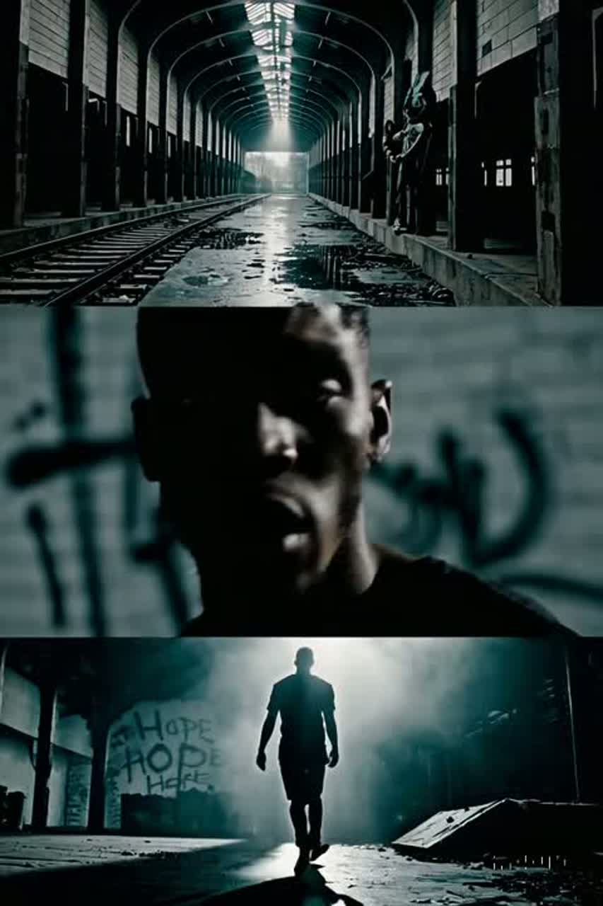 Cinematic hip-hop at 78 BPM—dark, intense, and soul-piercing, 808s hit like thunder under bowed cellos and trembling violins; snares snap like cracked concrete; distant horns moan through the fog, Sparse minor-key piano echoes between bars, each note heavy with dread, The beat breathes with tension—moments of silence cut through like gasps for air, Lead male rapper (E2–E4) delivers a raw, gravelly flow, half-spoken, half-pleaded, every syllable dripping with exhaustion and fight, His rhythm is deliberate, steady, like a heartbeat in chaos, A black female R&B soul singer (A3–A5) counters him with haunting power—low and smoky in verses, then erupting into desperate, trembling belts during the hook, Her harmonies rise like sirens in the storm, filling the space with emotion, The final chorus swells into a wall of sound—strings screaming, 808s rumbling, voices breaking—then everything drops to silence except one whispered word: alive