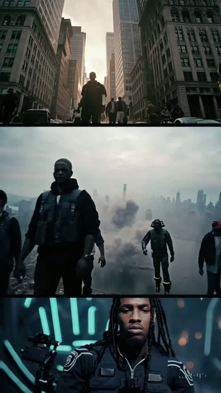 Starts with a gust of desert wind and faint metallic textures, tribal percussion and low thunder set an ominous intro in D minor at 85 BPM, Deep 808s and heavy snares drop in, punctuated by orchestral stabs, Male rapper’s gritty East Coast vocals cut through, trading with a female R&B/soul singer’s gospel-powered hooks and adlibs, echoing above shifting city-desert soundscapes, rain morphing into sandstorm, Faint Fremen-like chanting layers beneath, Final chorus surges with strings, low brass, choir pads, and stormy winds for a cinematic crescendo