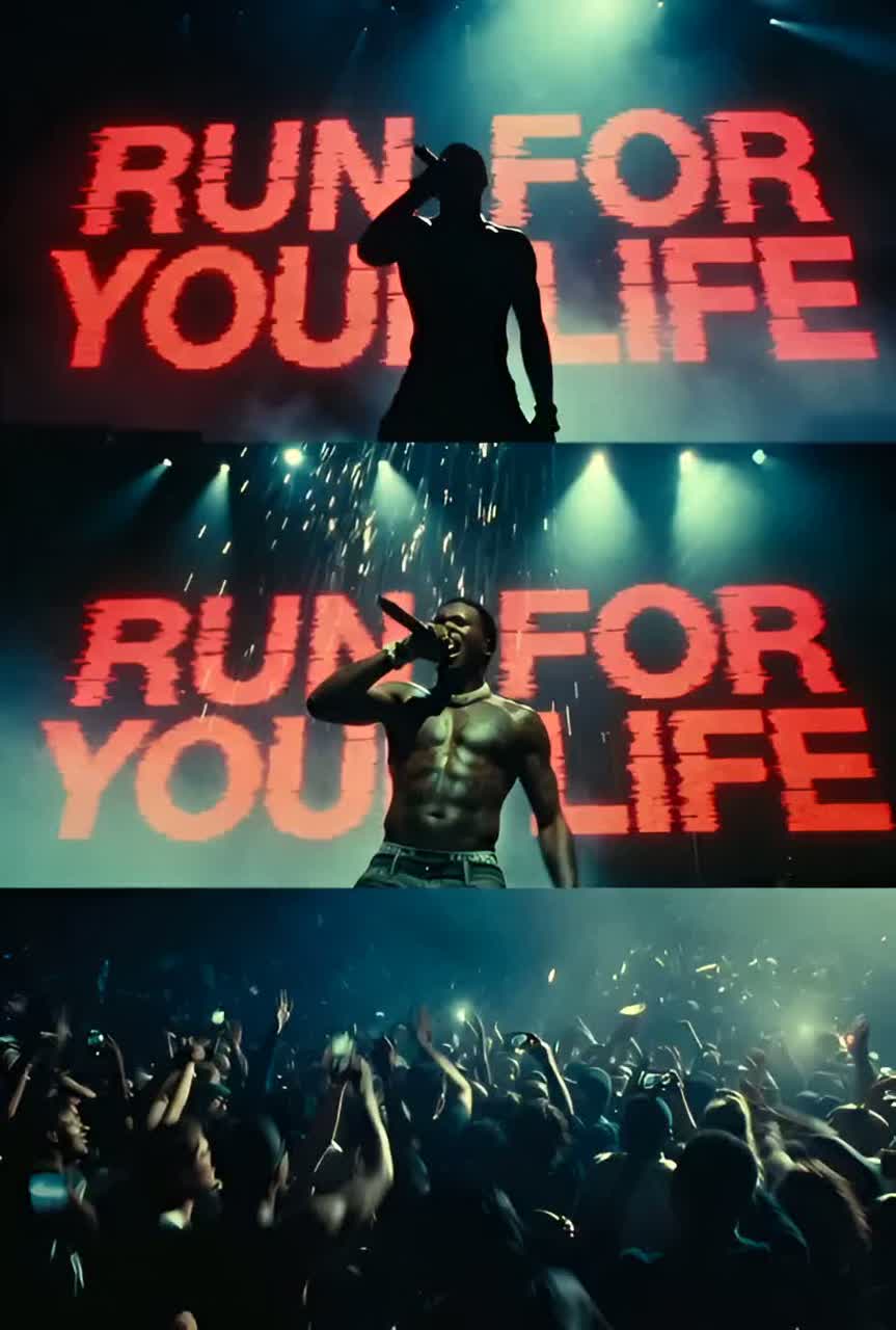 East Coast gangsta rap banger at ~92 BPM, built on crushing 808 drums, sub-heavy 808 bass, and a sharp, cracking 808 snare that hits like concrete punches, Drum machine and sampler-driven beat with grimy vinyl hiss, filtered piano stabs, and dark minor-key string chops beneath a thick low-end thump, all moving in a raw hip-hop groove, Vocal tone is gravelly, raspy, deep baritone (E2–E4), chest-voice dominant with gritty timbre and aggressive attack on consonants, Main rap is tight, rhythmic, and relentless, with staccato internal rhymes, ad-libs, and breathy end-of-bar growls, Backing vocals are self-layered: distant doubles, low-octave growls, and whispered “Run For Your Life” lines panned wide like voices in the dark, Extreme FX/SFX: sirens, gun-slide foley, vinyl stops, reverse breaths, crowd roars, and low sub drops accent key punchlines, Hook explodes with stacked vocal chants and whisper layers over the same brutal loop for a menacing, unstoppable feel