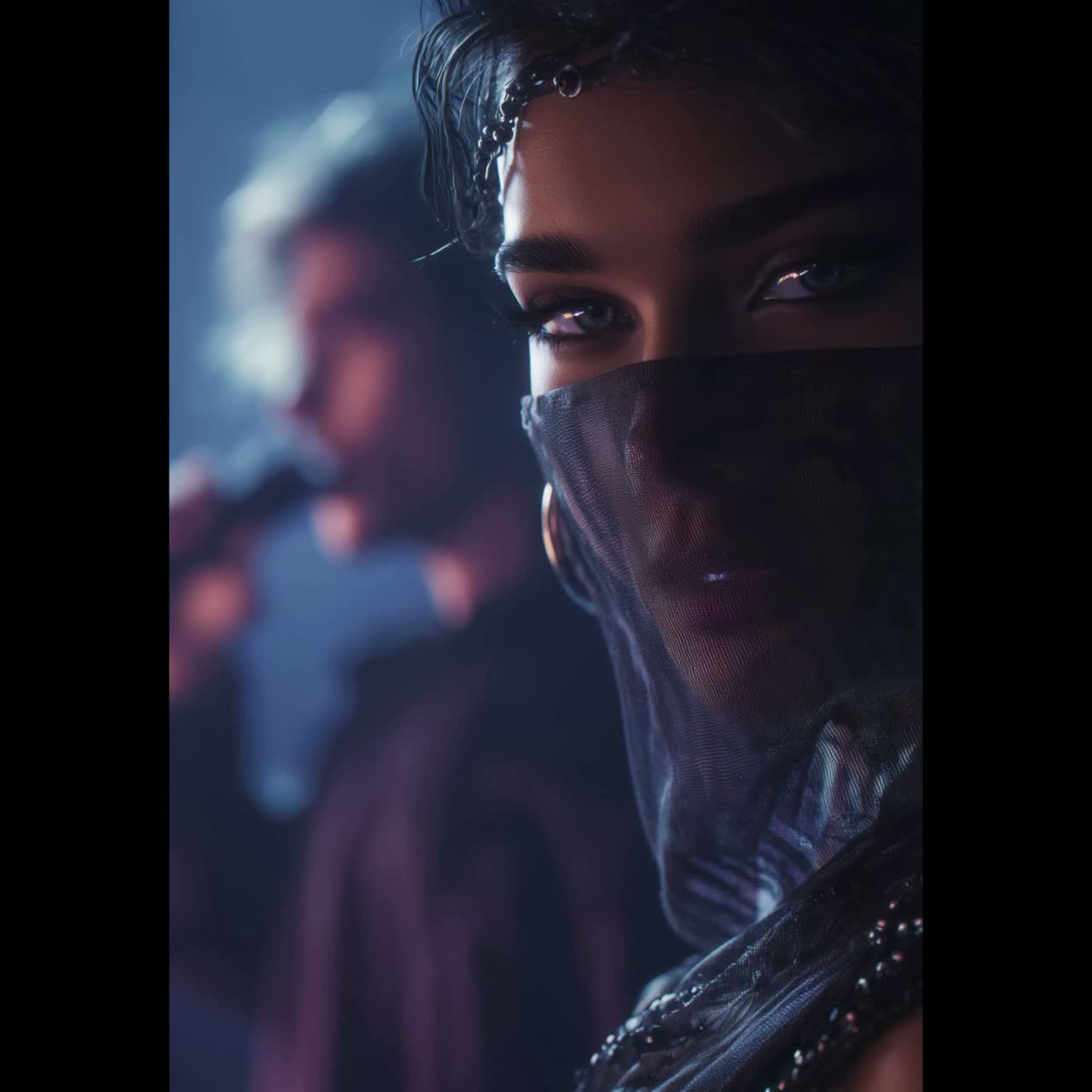 nu-metal, rap-metal, male rap/female eastern vocal, european flow, 150 bpm, distorted guitars, deep bass, glitchy vinyl noise, cinematic atmosphere
