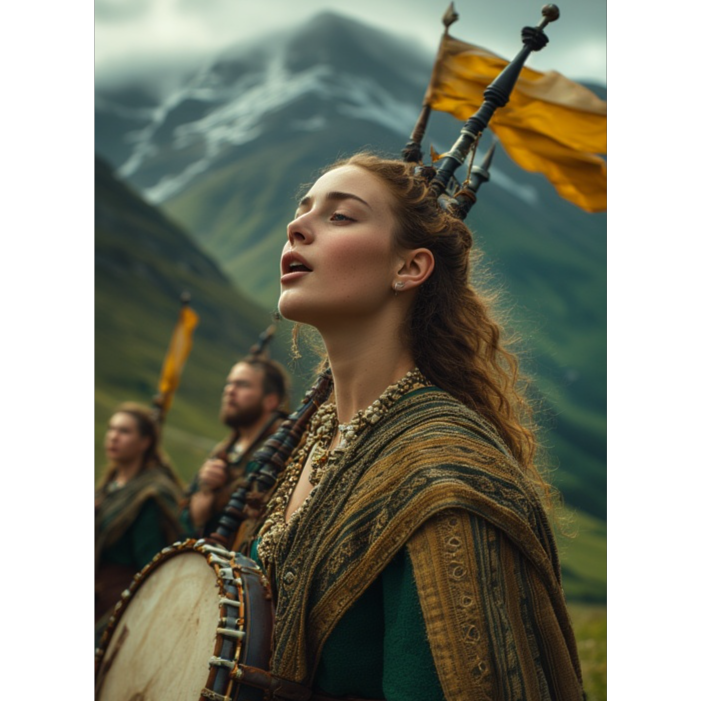 [Scotland folk bagpipes line, frame drum pre-1500 AD style]