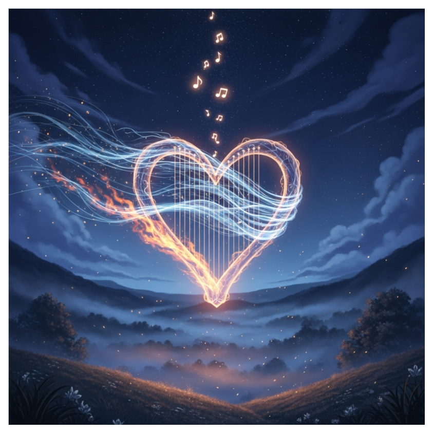 Harp, hurdy-gurdy, lute, frame drum, flute, Two voices (male/female), modal melody (Dorian or Aeolian), 68–72 BPM, free-floating, like a pilgrim's song at dusk, Spiritual, delicate, worldly, yet devout—like a minstrel's lament for a time between nature and creation