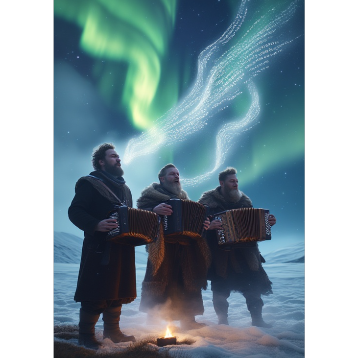 Nordic pre-1200 AD style, Strings: Lyra, Tagelharpa/Jouhikko, Kantele, Winds: Lur, birch-bark or bone flute, animal/wood horn, Percussion: frame drum, shaman drum, wood mallet, bone rattle, stone hits, Atmosphere: natural reverb, wind, ravens, runic whispers, cold ambient tone