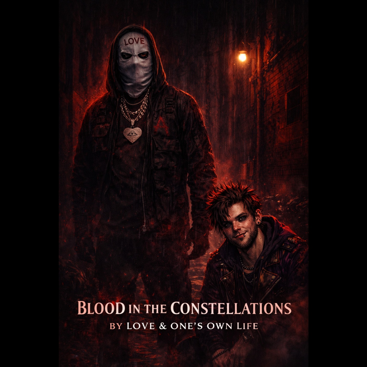 All Male Duet only, Gruff Edgy male Vocals, Intimate Breathy Emo-Punk male vocals, Dark Dream-Pop, Dark Alt-Pop, Industrial Rock, Glitchy Avant-Pop, Gritty Analog Synths, Distorted 808 Bass, Eerie Music Box, Thumping Stomp-Kick, Cinematic Tension, 85 BPM, electric guitar, rythmic rap singing, reverb cello, acoustic guitar, steel guitar, conga drums, reverbed harp, opposing heavy bass, kick drum, reverb bass guitar, distorted drum set, dark cinematic, eerie echoes, emotional, intimate, free flow vocals, harmonized, grunge on verge of screaming