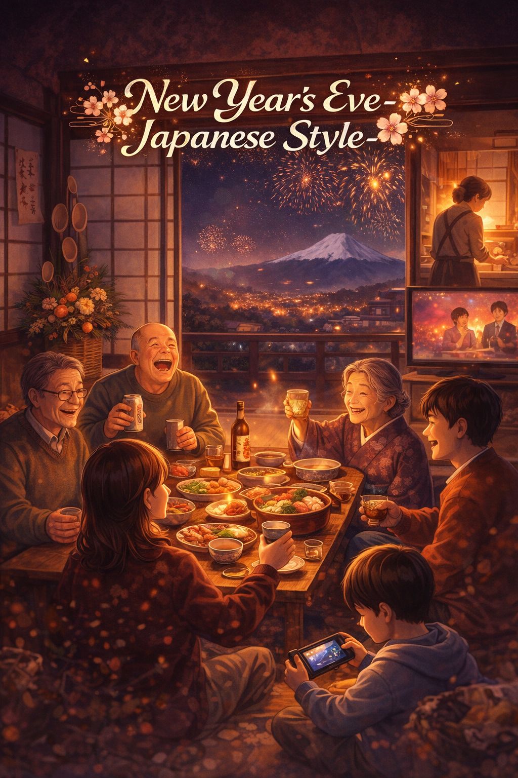 Hard rock anime style modern Japanese fusion song with traditional Japanese instruments, Mix distorted rock guitars and drums with koto, shamisen, taiko, and shakuhachi, Include strong call and response vocals in the final choruses, main vocal shouting “Kotoshi mo!” with group backing vocals responding together, Use 8bit chiptune sounds only in intro, bridge, and outro, Anime opening/ending vibe, nostalgic, warm, slightly chaotic like a family New Year gathering, Mid-tempo groove, emotional Japanese male vocal, Use natural, organic performances for traditional instruments, avoid synthetic or overly quantized sounds