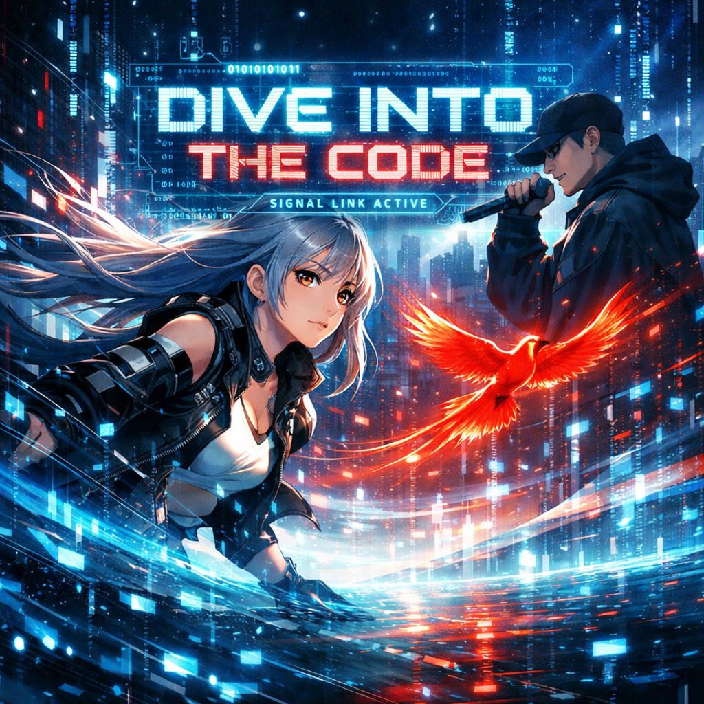 Japanese progressive trance anime opening style, J-POP, BPM 150, Bright supersaw lead, uplifting trance arpeggio hook acting as a second chorus, wide atmospheric pads and deep driving trance bass, Powerful female vocal with strong high notes for verses and chorus, emotional and slightly melancholic tone, English and Japanese mixed lyrics, Female vocal dominates the song, Male rap appears only in the bridge sections, Structure: intro with pad and arpeggio build, female vocal verse, female vocal pre-chorus, instrumental arpeggio hook, chorus, instrumental break, male rap bridge, build arpeggio, trance drop, narrative male rap bridge, final double chorus, long atmospheric trance outro with fading pads, Theme: cyber world dive, neural network, signals and code, poetic imagery with light, data ocean and a red bird flying through digital light, No idol pop, cinematic anime opening energy, futuristic and emotional