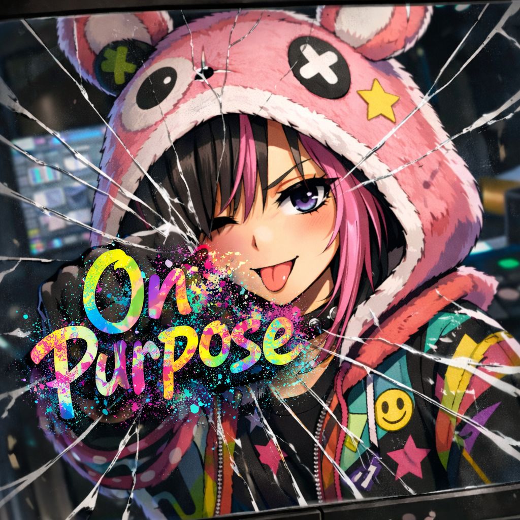 Japanese style, Hardcore Rock track with female vocals, punk rock, Aggressive and self-aware production, Heavy use of vocal chops and voice fragments as rhythmic elements rather than emotional singing, Frequent and exaggerated pitch jumps, sudden octave shifts, unstable pitch movement, and intentional overuse of pitch shifting, Voices treated like percussive instruments, Raw and imperfect rock attitude combined with hardcore energy, Playful, chaotic, and self-mocking tone, Fast attack, tight gating, and chopped vocal timing locked to the rhythm