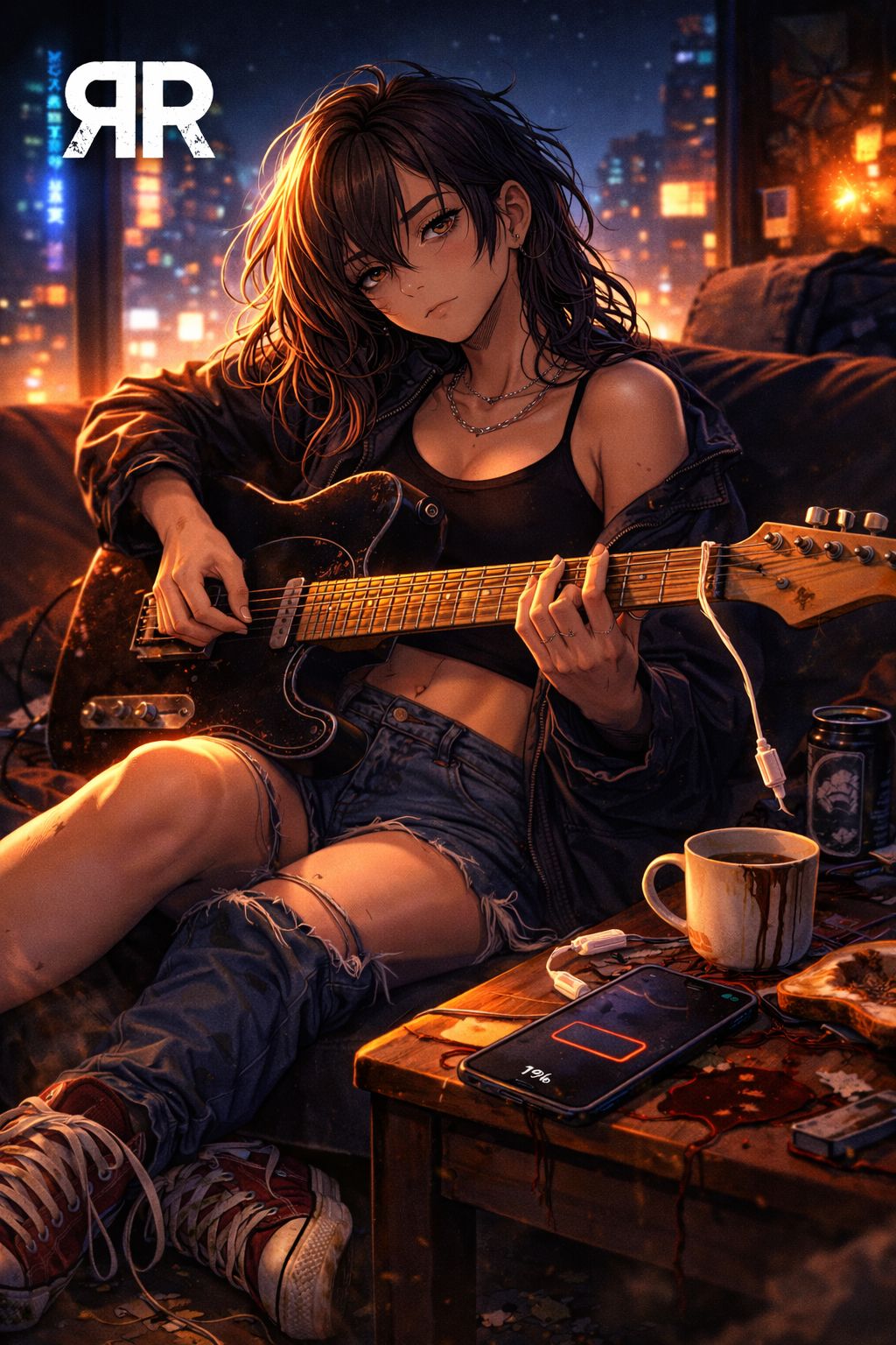 A Japanese-style loud rock track with hardcore aesthetic, fast BPM, hard-hitting drums including double bass, distorted guitars, and prominent lead bass carrying the melody until the last chorus, Include a short break (0, 5–1 bar of silence) just before each chorus for dramatic effect, Female vocals, raw and slightly raspy, deliver humorous everyday life lyrics in English with clear articulation, slightly over the top but catchy, Intro contains whispered spoken line: "Yesterday… I found something naughty… my brain went wobbly… Forgot to charge my phone, and somehow fell asleep…" Keep overall sound aggressive, energetic, chaotic, and edgy, emphasizing Japanese hardcore style with minor reverb and no overly clean or pop feel, No specific artist names mentioned