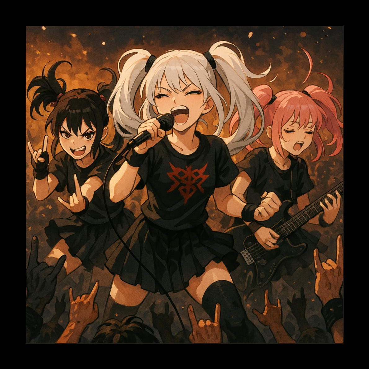 Kawaii Metal, Thrashcore, J-Pop Mix, High-energy cute female vocals with screamo FX, Drop-tuned guitar riffs, 808 kicks, double bass drums, glitchy FX