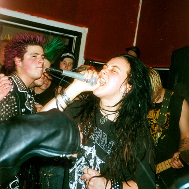 Hardcore punk, shrieking female vocals, dark metallic riffs, D-beat drums, raw aggressive energy, 165 bpm, crust punk influence, haunting breakdown, fierce urgent tone, DIY production style