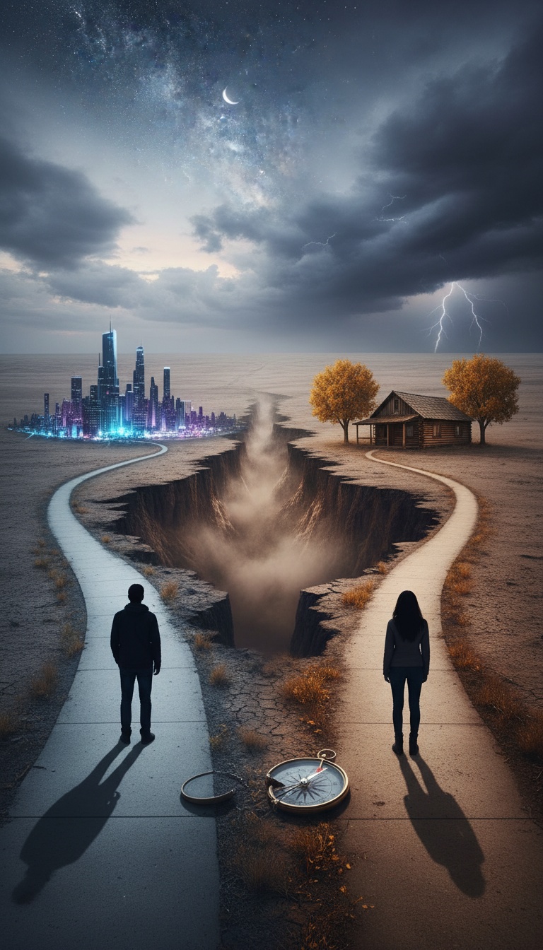 Brooding piano and reverberant clean electric guitar shape the verses, supported by pulsing synth bass and haunting strings woven with subtle electronic textures, Choruses explode with dramatic, layered harmonies, timpani, and deeply emotional, gritty vocals, The bridge shifts to ethereal choir and swelling strings, gradually building into a grand, bittersweet orchestral finale filled with powerful hard rock energy, (violins/cellos) heavy distorted guitars, deep bass, and pounding drums, Add a slow-building string section