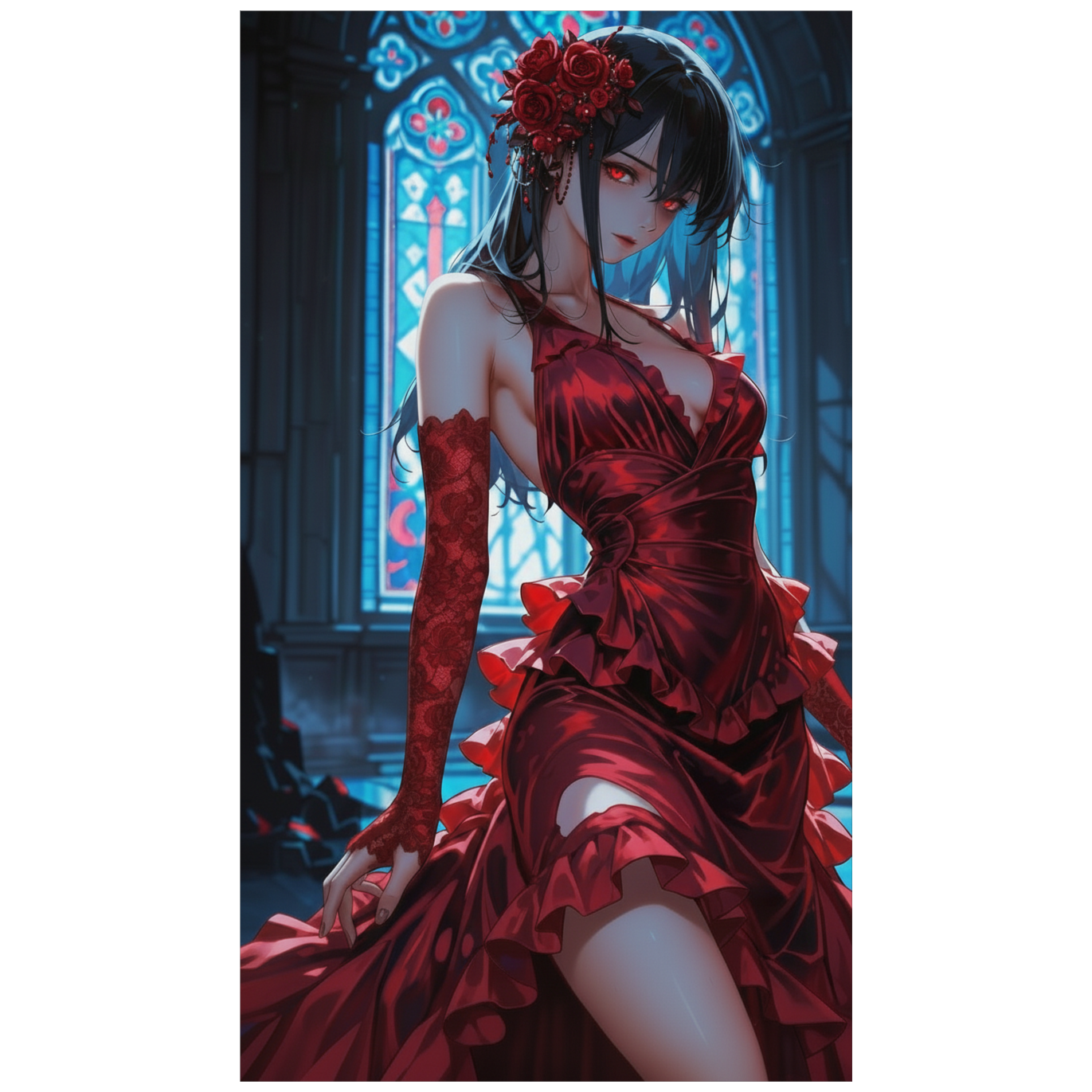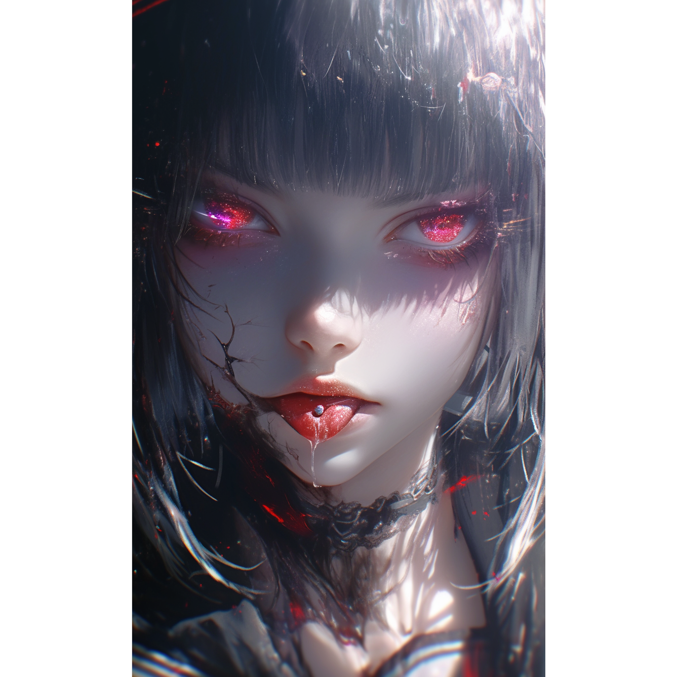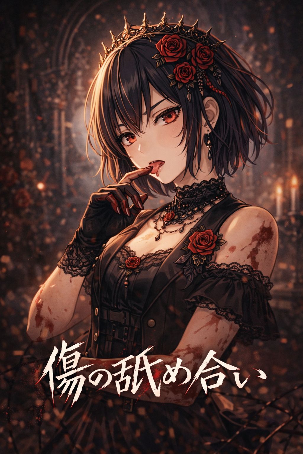 A dark, heavy female-vocal metalcore track with a dramatic, decadent atmosphere, Vocal is female only, using high-range melodic singing, sharp shouts, female growl, female pig-squeal, and brief whistle-like high accents, No male timbre or baritone, Guitars are strict Drop-A, extremely heavy, wide, and metallic with deep chugs, Bass is distorted, dark, and punishing, Drums feature fast twin-kick, sharp snare, and aggressive fills, Synths use digital-noise textures, glitch arps, corrupted choirs, and dark pads to add an industrial edge, Style blends metalcore, loud rock, and digital industrial, keeping a melodic but violent tone, Chorus should feel emotional with soaring female vocals; verses more rhythmic and harsh, Mixing: female vocal forward, guitars thick, bass deep, kicks strong, synths adding tension without masking heaviness