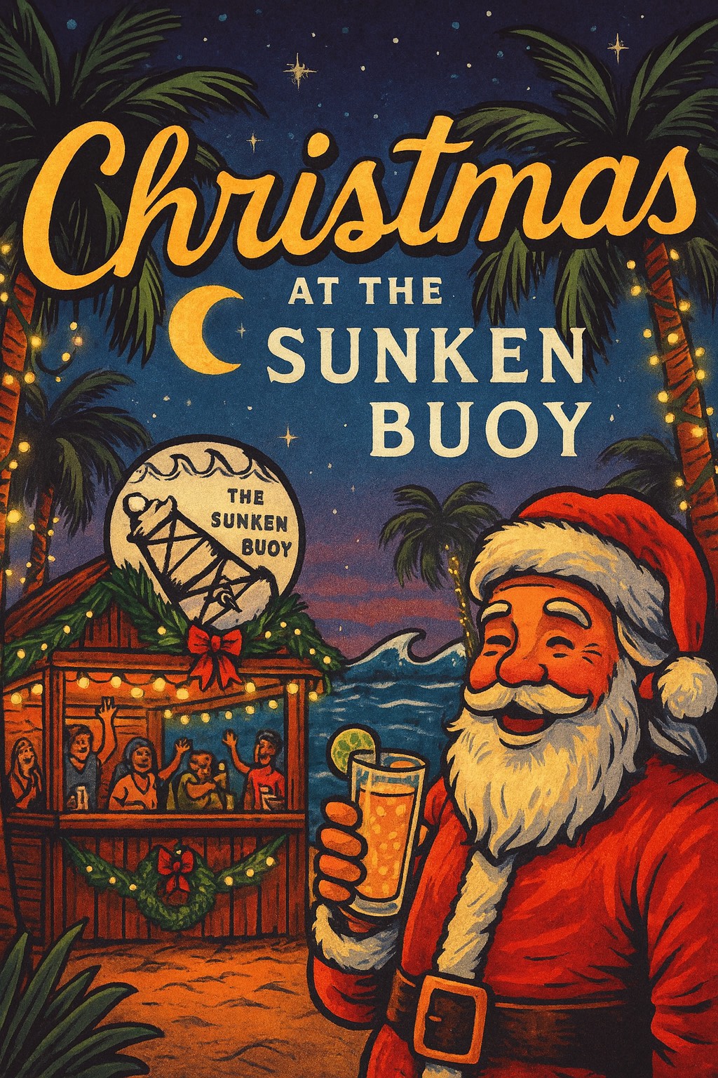 (Classic Christmas style with a warm Caribbean sway—steel drums lightly chiming, gentle reggae groove underneath, sleigh bells blended with island percussion, )