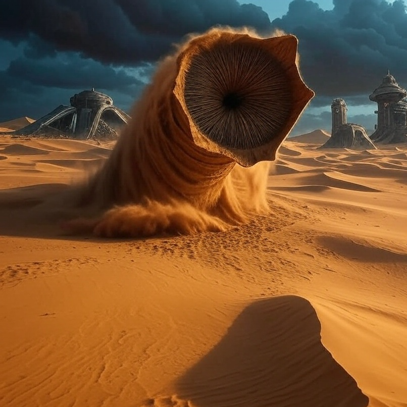 Style: Scifi Haunting, droning synths mixed with tribal percussion, like shifting sands and distant worm rumbles, Male Vocals: Doom layered chants, Mood: Ominous, seductive, and relentless, pulling the listener into the planet’s maw, Effects: cinematic, cryptic, spectacular, futuristic, ancient, epic