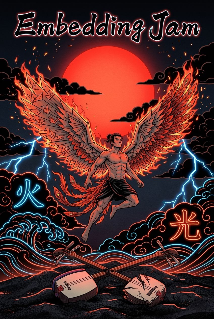 High-energy J-Rock and Wagakki fusion, 165 BPM, Features a shredding electric guitar doubled by a fast-paced, rhythmic Shamisen, Thunderous Taiko drum percussion mixed with a modern rock kit, The vocals are powerful and emotive in a Japanese "Visual Kei" style, with dramatic vibrato and high-pitched belts, Deep, resonant Koto glissandos during the transitions, The mood is intense, fiery, and theatrical