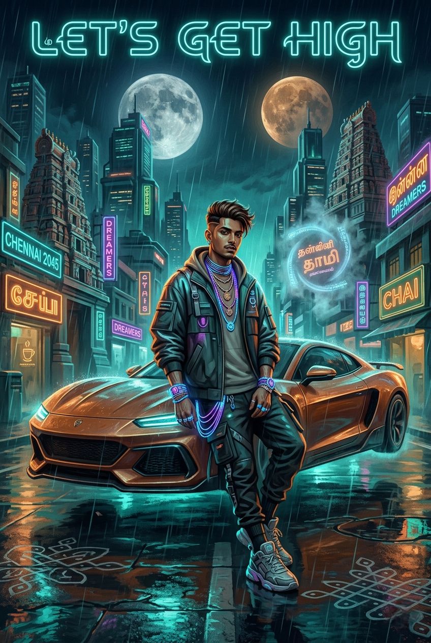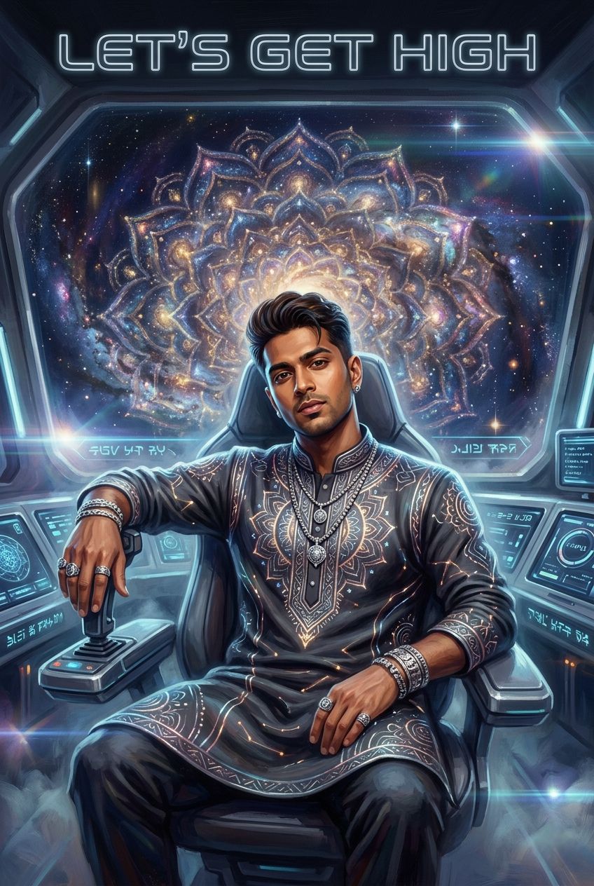 High-tempo Experimental Indian Cyber-Fusion, 160 BPM, Aggressive, futuristic sound design meets traditional classical elements, Fast-paced, complex Tabla breakbeats layered with heavy industrial 808s, Distorted, glitchy Sitar riffs and shimmering electric Tanpura drones, Lead male vocals blending soulful Indian classical ornaments (gamaks) with rapid-fire, rhythmic delivery, Atmospheric space-age textures, metallic foley, and interstellar synth sweeps, High-energy, non-linear structure with a heavy 'Timbo' bounce reimagined for a high-speed galactic journey