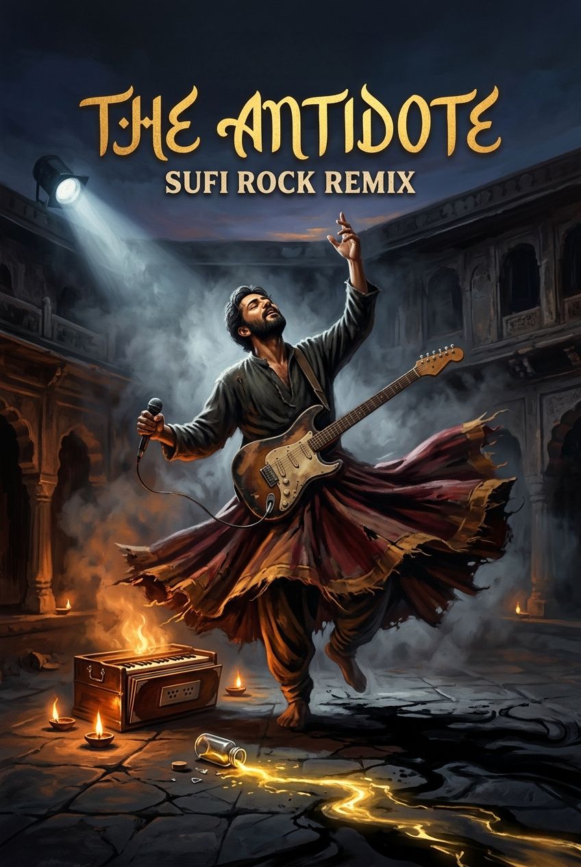 Indian Sufi Rock, 100 BPM, Gritty Harmonium textures, overdriven electric guitar arpeggios, fusion of Rock drums and Tabla, Soaring, passionate male vocals, A build-up of intensity leading to a psychedelic, guitar-heavy chorus, Raw and spiritually intense