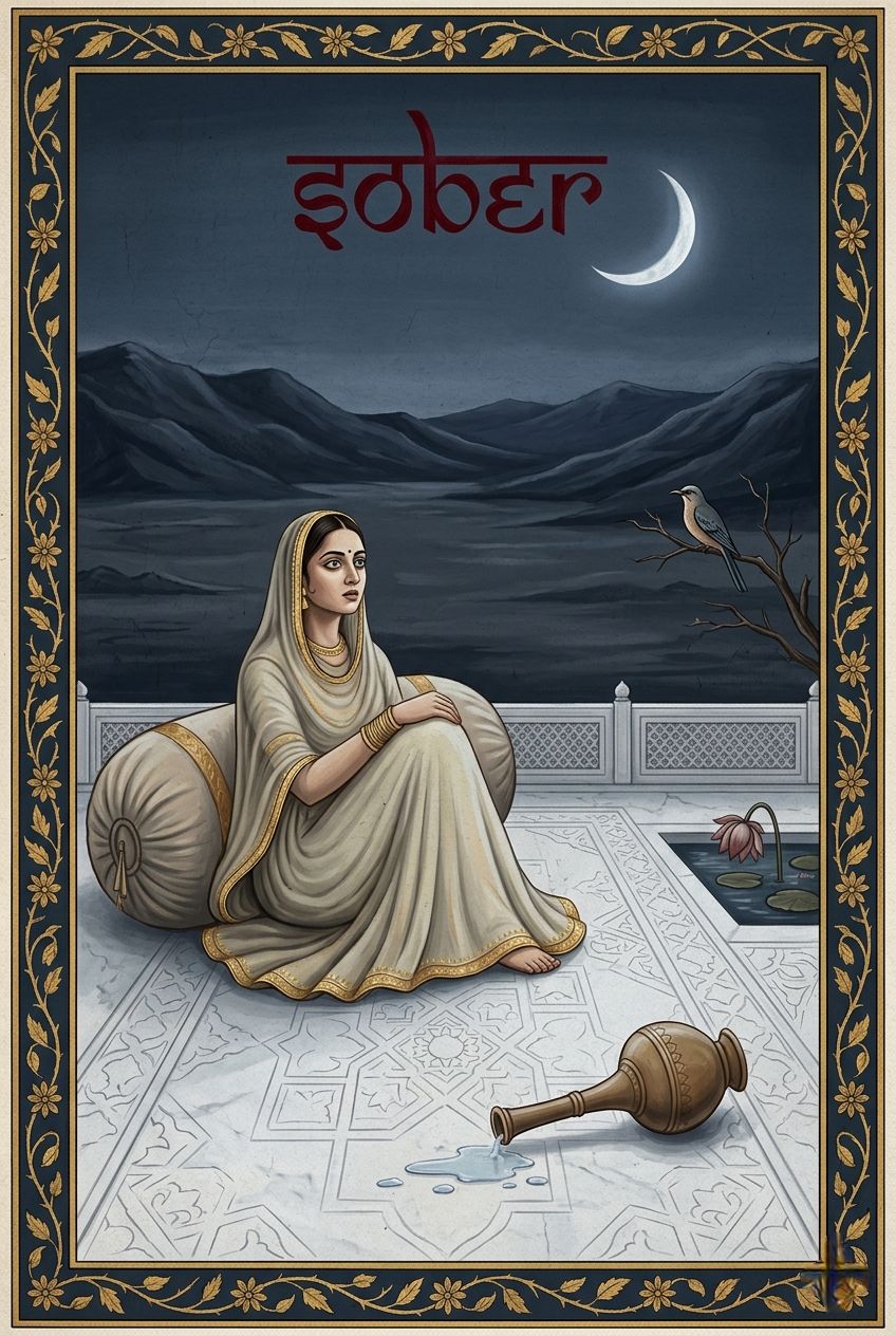 A soulful Indian semi-classical track, Deeply melancholic and evocative, set in a midnight Raag, The acoustic arrangement is anchored by a continuous, resonant Tanpura drone, intertwined with slow, expressive Sitar melodies and the weeping, emotional tones of a Sarangi, The rhythm is carried by a gentle but intricate acoustic Tabla beat in Keherwa taal (8-beat cycle), The female vocal performance is classically trained and deeply emotional, featuring expressive alaaps (vocal improvisations), complex harkats (vocal runs), and smooth meends (pitch glides) that emphasize the pain and longing in the lyrics, The tempo is slow, meditative, and raw, sitting around 65 BPM with a rich, natural acoustic room reverb