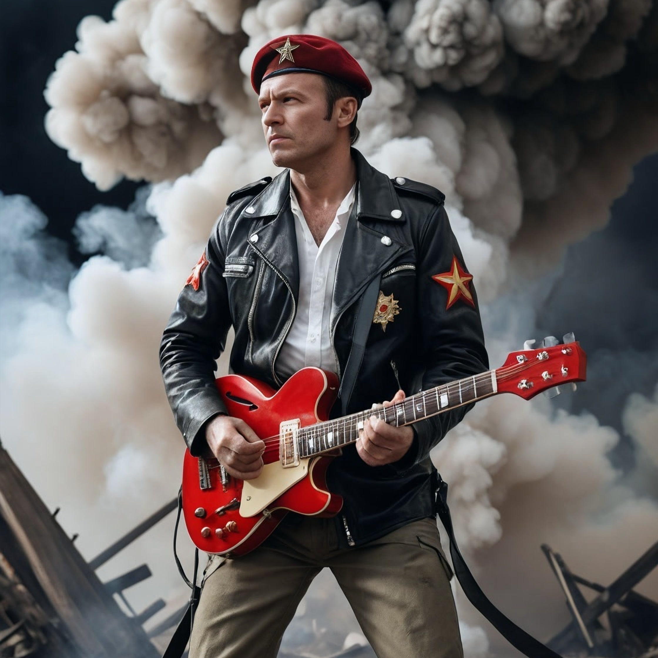 guitar riffs with a strong distortion effect, synthesizers in parallel, Vocals: with a slight aggression