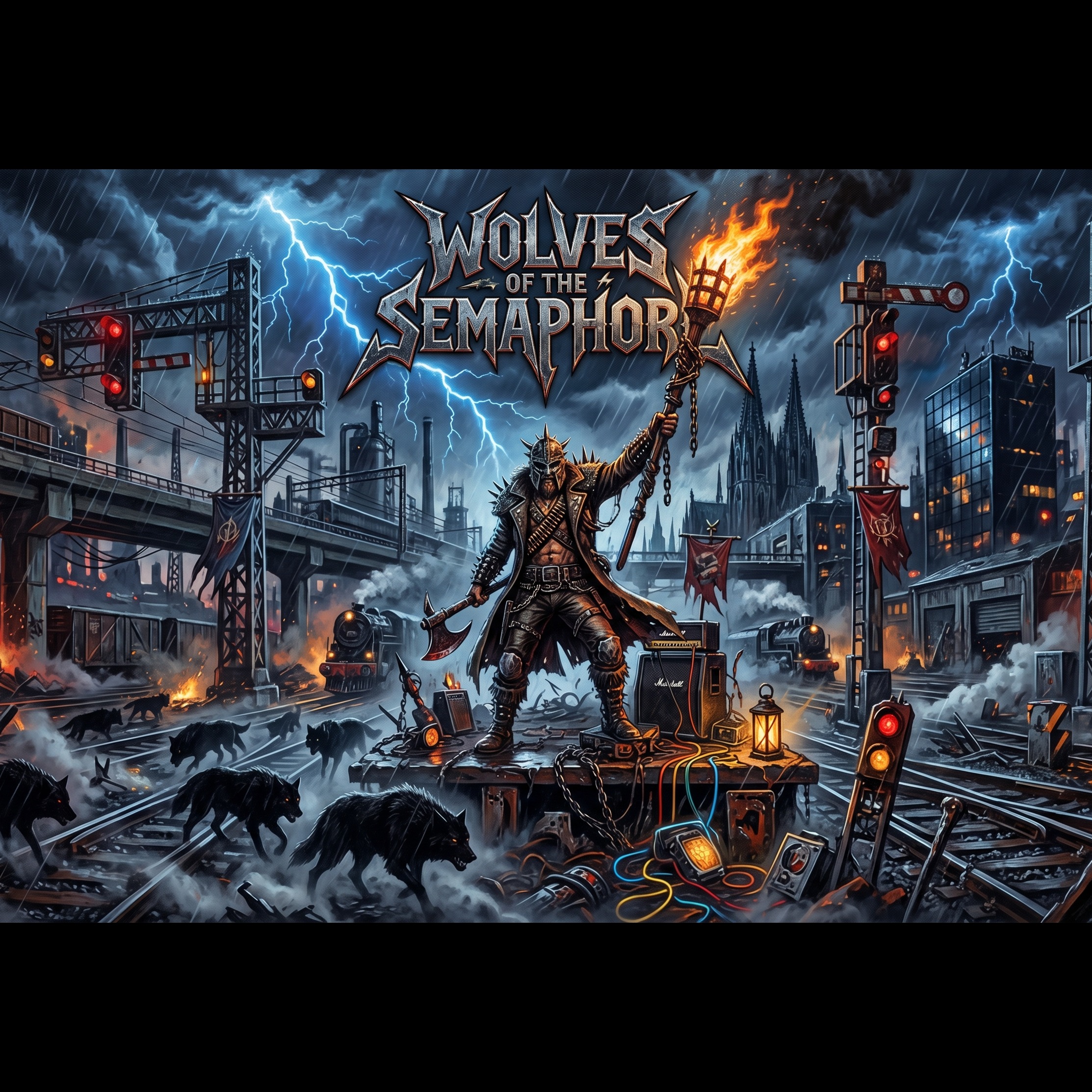 European underground heavy/speed metal from the 1990s to today, inspired by obscure but vibrant continental steel without copying any single band, Title: Wolves of the Semaphore, Key: F# minor, Tempo: 158 BPM, Use tight 4/4 drums, galloping rhythm guitars, twin-lead harmonies, melodic bass that stays clearly audible, and a sharp analog-grit mix, Vocals: forceful male tenor with grit, urgency, and anthemic chorus lift, Mood: railyard midnight metal, signal tower, chrome rain, black mirrors, wolves, border highways, warning lights, ritual fire, and outlaw devotion, Arrangement: tense intro, riff-heavy verse, rising pre-chorus, explosive chorus, second verse, bridge, melodic solo, final double chorus, defiant outro, Dark, vivid, fast, heroic, underground and faithful to European metal spirit