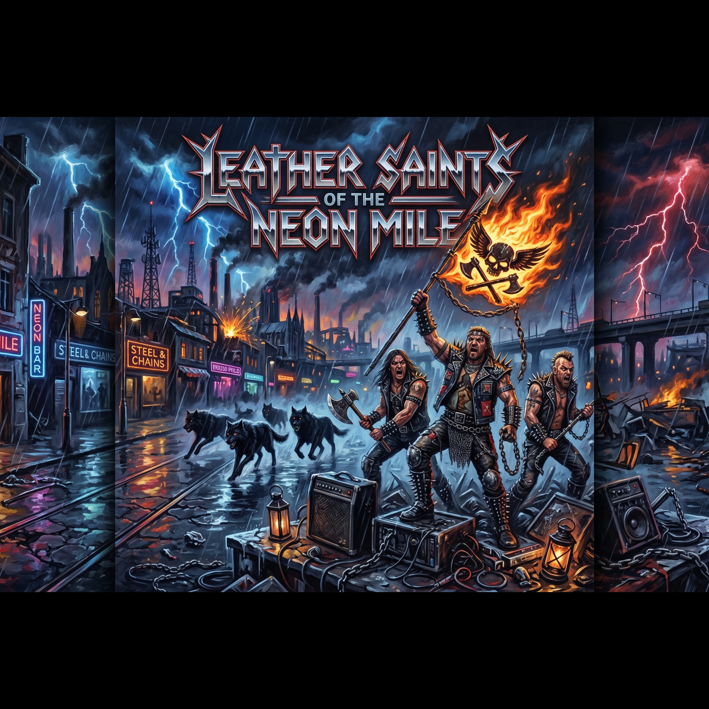 European underground heavy/speed metal from the 1990s to today, inspired by obscure but vibrant continental steel without copying any single band, Title: Leather Saints of the Neon Mile, Key: E major, Tempo: 154 BPM, Use tight 4/4 drums, galloping rhythm guitars, twin-lead harmonies, melodic bass that stays clearly audible, and an analog-grit mix, Vocals: forceful male tenor with grit, urgency and chorus lift, Mood: streetwise melodic heavy metal, neon rain, chrome reflections, radio towers, leather brotherhood, border streets, wolves, ritual fire and outlaw devotion, Arrangement: tense intro, riff-heavy verse, rising pre-chorus, explosive chorus, second verse, bridge, melodic solo, final double chorus, defiant outro, Dark vivid, heroic, underground, faithful to true European metal spirit