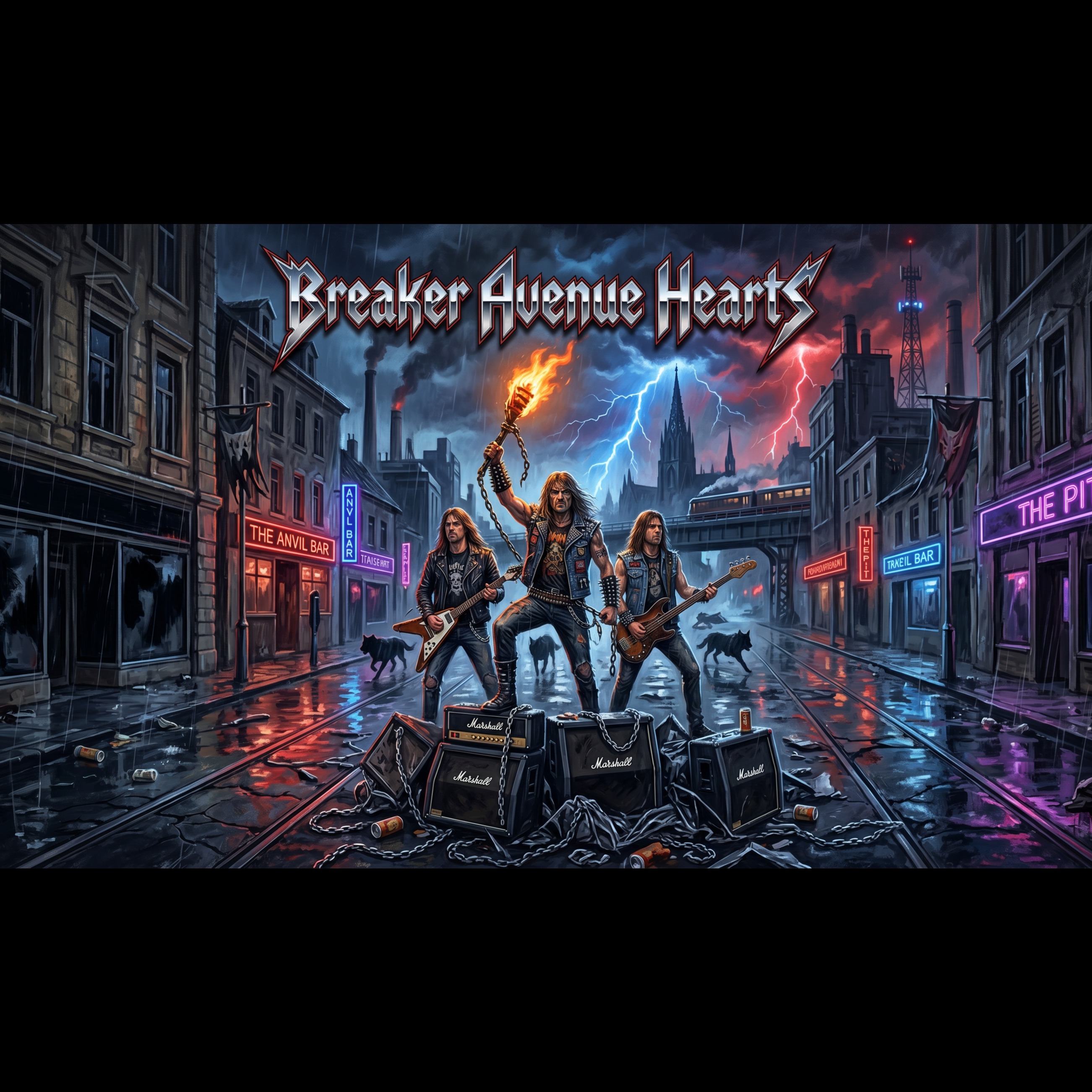 European underground heavy/speed metal from the 1990s to today, inspired by obscure but vibrant continental steel without copying any single band, Title: Breaker Avenue Hearts, Key: F# minor, Tempo: 152 BPM, Use tight 4/4 drums, galloping rhythm guitars, twin-lead harmonies, melodic bass that stays clearly audible, and an analog-grit mix, Vocals: forceful male tenor with grit, urgency and anthemic chorus lift, Mood: streetwise melodic heavy metal, neon rain, chrome reflections, radio towers, leather brotherhood, border streets, wolves, ritual fire and outlaw devotion, Arrangement: tense intro, riff-heavy verse, rising pre-chorus, explosive chorus, second verse, bridge, melodic solo, final double chorus, defiant outro, Dark vivid, heroic, underground, faithful to true European metal spirit
