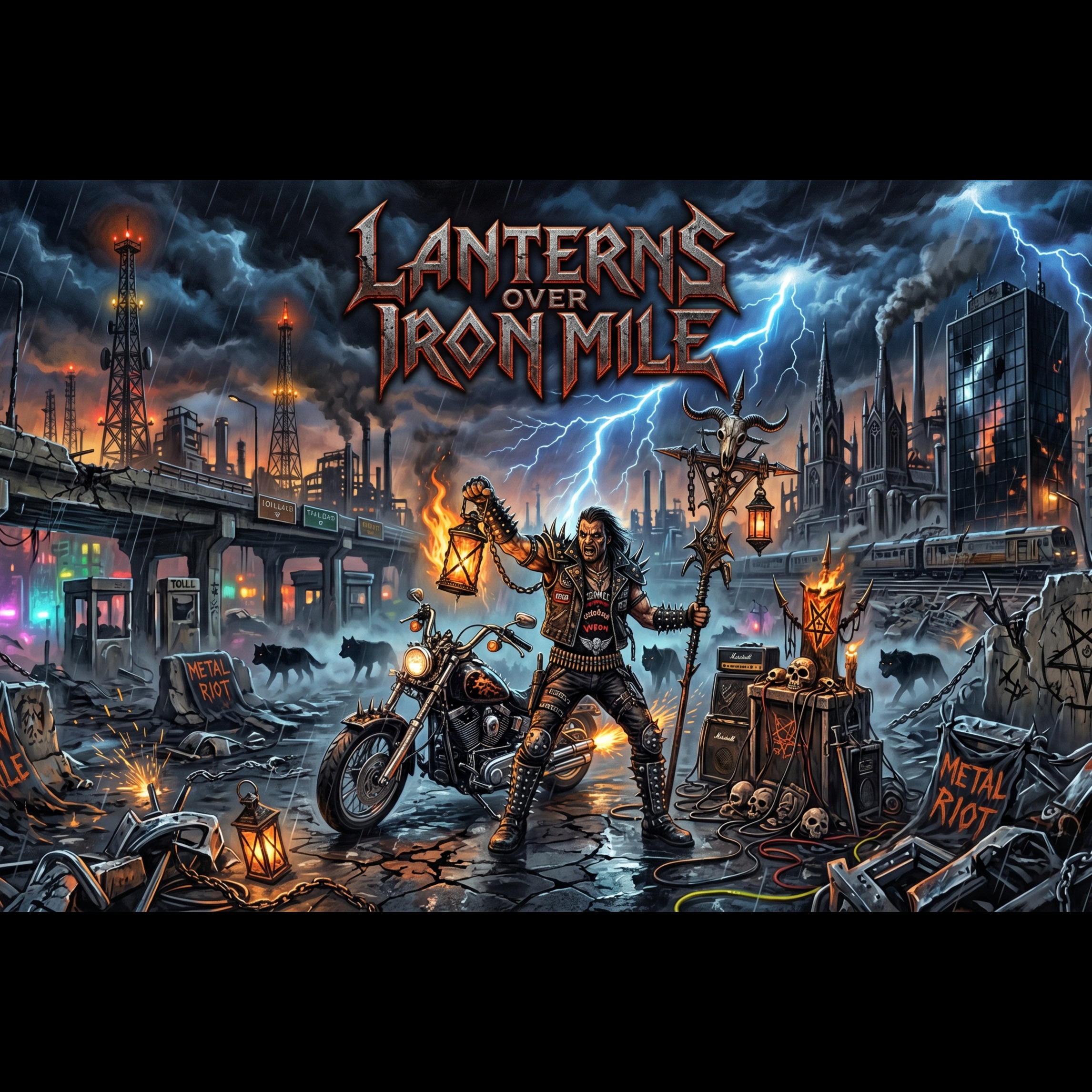 European underground heavy/speed metal from the 1990s to today, inspired by obscure but vibrant continental steel without copying any single band, Title: Lanterns Over Iron Mile, Key: A minor, Tempo: 159 BPM, Use tight 4/4 drums, galloping rhythm guitars, twin-lead harmonies, melodic bass that stays clearly audible, and a sharp analog-grit mix, Vocals: forceful male tenor with grit, urgency, and anthemic chorus lift, Mood: occult road metal, lantern light, border rails, chrome rain, wolves, ritual fire, storm highways, and midnight steel devotion, Arrangement: tense intro, riff-heavy verse, rising pre-chorus, explosive chorus, second verse, bridge, melodic solo, final double chorus, defiant outro, Dark, vivid, fast, heroic, underground, faithful to true European metal spirit, Ride tonight!