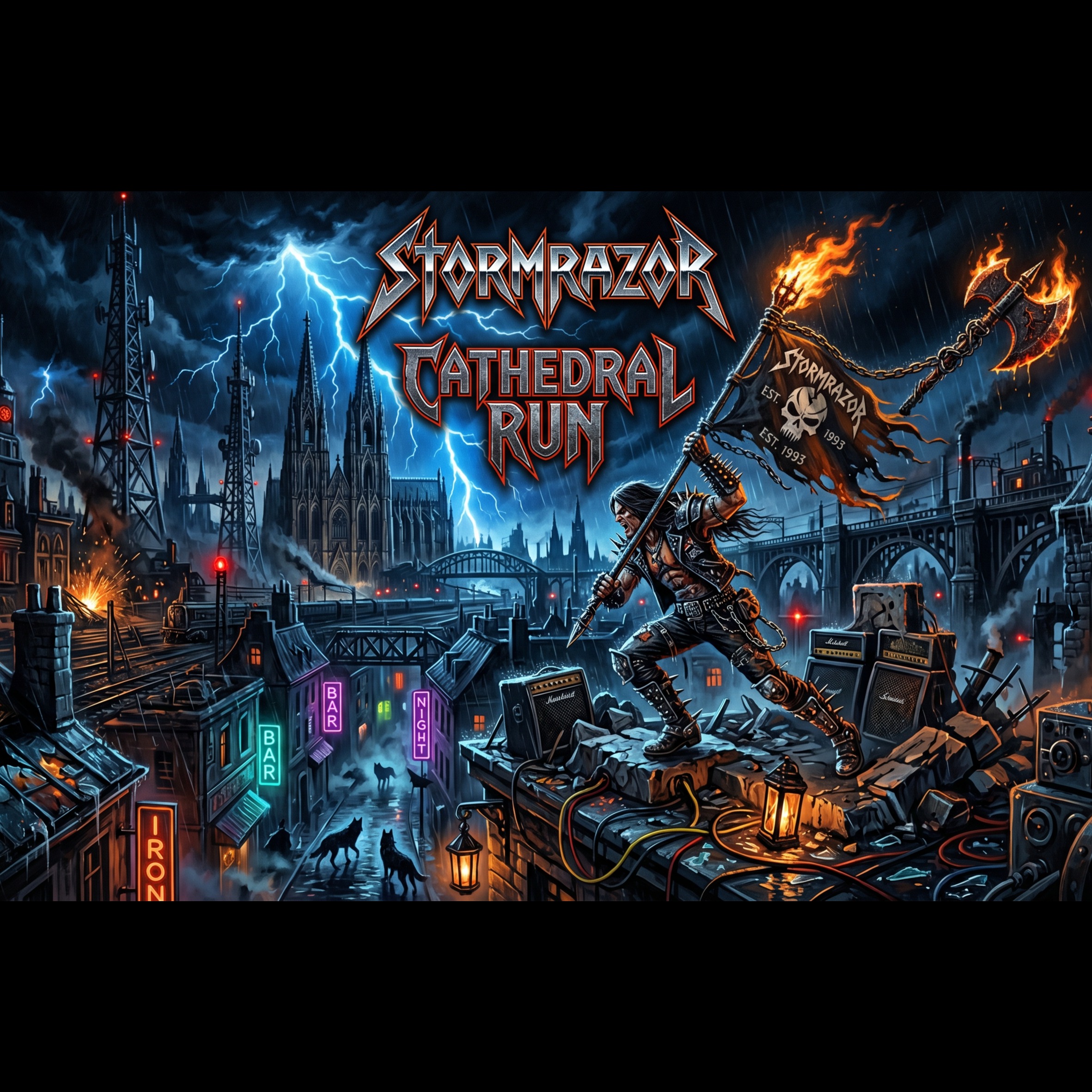 European underground heavy/speed metal from the 1990s to today, inspired by obscure but vibrant continental steel without copying any single band, Title: Cathedral Run, Key: E minor, Tempo: 162 BPM, Use tight 4/4 drums, galloping rhythm guitars, twin-lead harmonies, melodic bass that stays clearly audible, and a sharp analog-grit mix, Vocals: forceful male tenor with grit, urgency, and anthemic chorus lift, Mood: urban cathedral speed metal, storm highways, radio towers, chrome rain, wolves, ritual fire, black mirrors, and outlaw devotion, Arrangement: tense intro, riff-heavy verse, rising pre-chorus, explosive chorus, second verse, bridge, melodic solo, final double chorus, defiant outro, Dark, vivid, fast, heroic, underground, faithful to true European metal spirit, Midnight battle cry!!