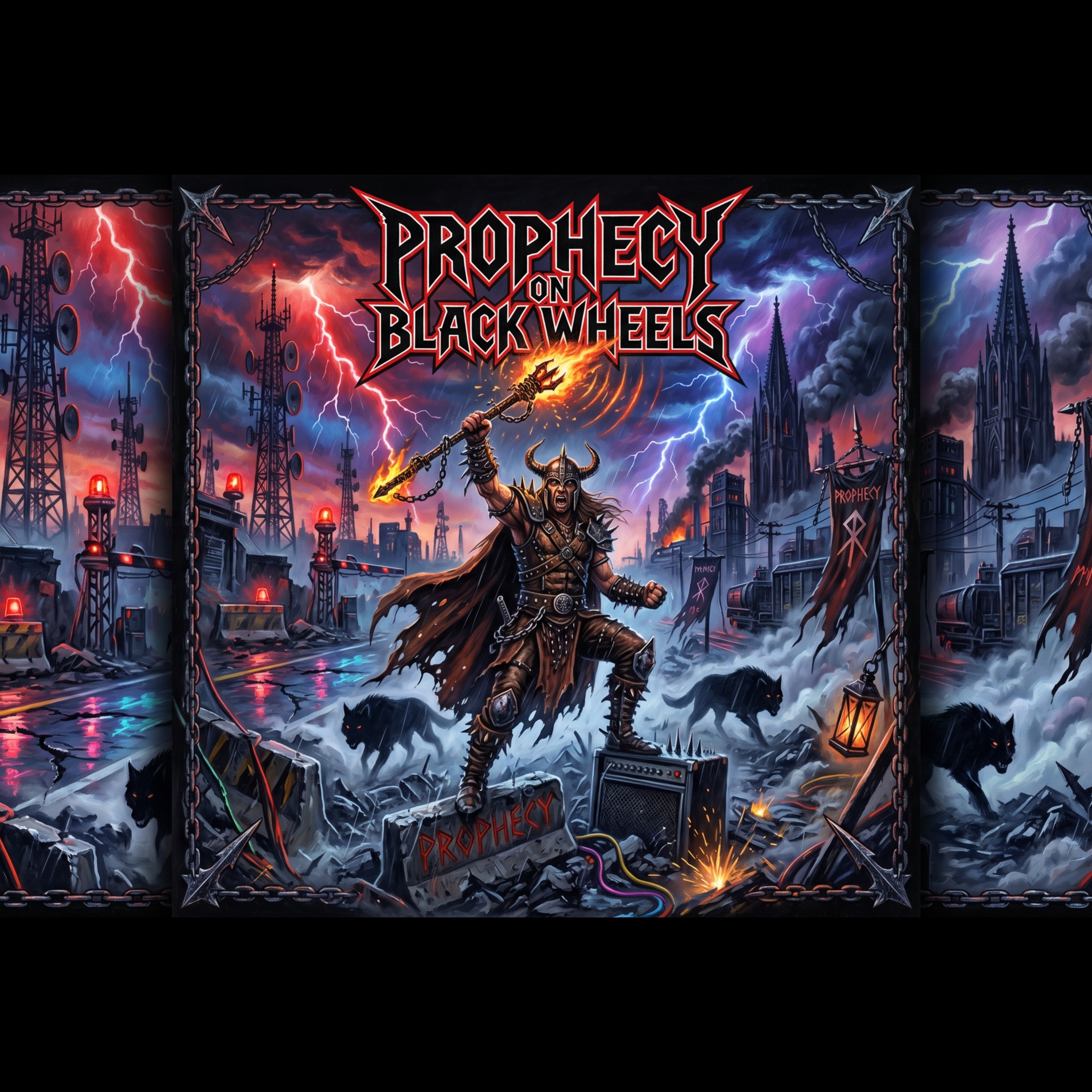 European underground heavy/speed metal from the 1990s to today, inspired by obscure but vibrant continental steel without copying any single band, Title: Prophecy on Black Wheels Key: B minor, Tempo: 153 BPM, Use tight 4/4 drums, galloping rhythm guitars, twin-lead harmonies, melodic bass that stays audible and a sharp analog-grit mix, Vocals: forceful male tenor with grit, urgency, and anthemic chorus lift, Mood: occult broadcast heavy metal, radio towers, black mirrors, chrome rain, wolves, storm highways, checkpoint ruins, ritual fire, prophecy, and outlaw devotion, Arrangement: intro, riff-heavy verse, rising pre-chorus, explosive chorus, second verse, bridge, melodic solo, final double chorus, defiant outro, Dark vivid, fast, heroic, underground, and faithful to European metal spirit