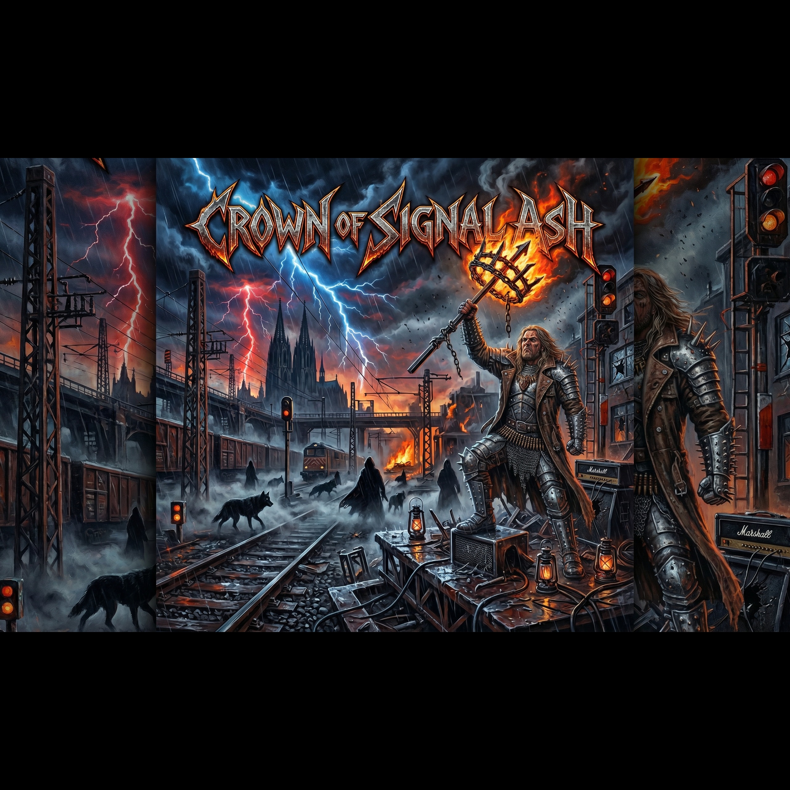 European underground heavy/speed metal from the 1990s to today, inspired by obscure but vibrant continental steel without copying any single band, Title: Crown of Signal Ash, Key: C minor, Tempo: 156 BPM, Use tight 4/4 drums, galloping rhythm guitars, twin-lead harmonies, melodic bass that stays clearly audible, and a sharp analog-grit mix, Vocals: forceful male tenor with grit, urgency, and anthemic chorus lift, Mood: signal-ash storm metal, border towers, chrome rain, black mirrors, wolves, warning beacons, dead freightlines, ritual fire, outlaw devotion, Arrangement: tense intro, riff-heavy verse, rising pre-chorus, explosive chorus, second verse, bridge, melodic solo, final double chorus, defiant outro, Dark, vivid, fast, heroic, underground, faithful to true European metal spirit, raw