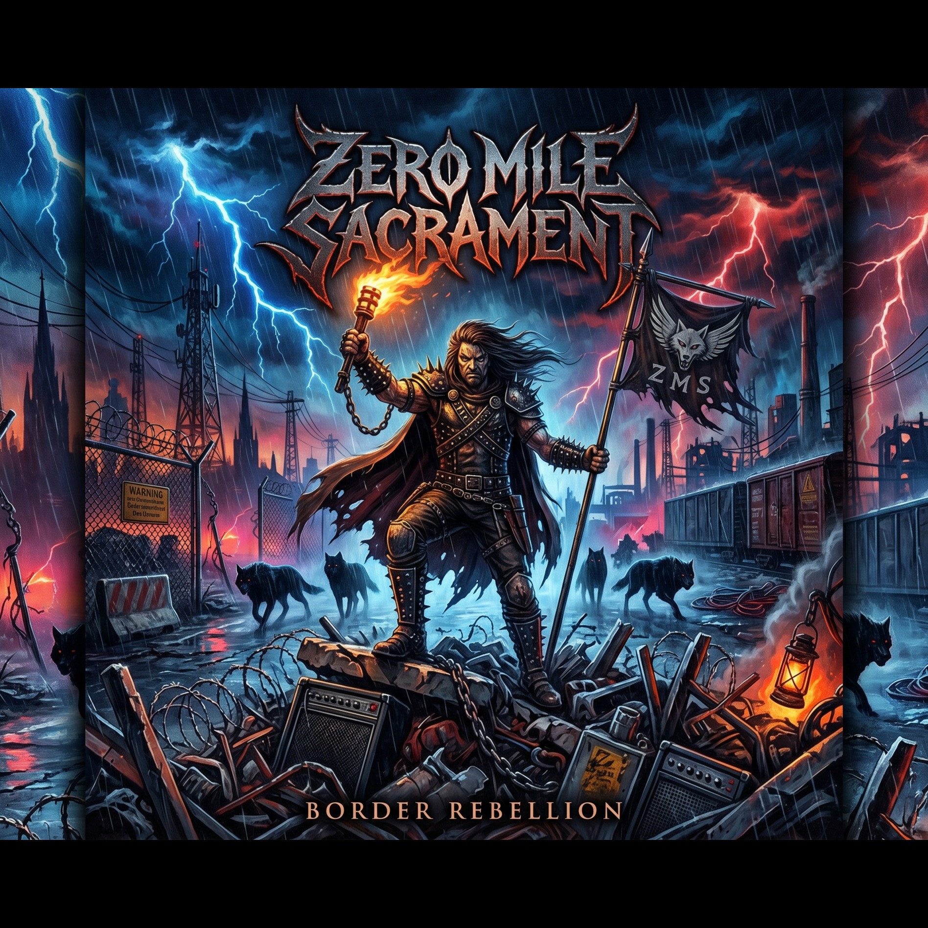 European underground heavy/speed metal from the 1990s to today, inspired by obscure but vibrant continental steel without copying any single band, Title: Zero Mile Sacrament, Key: D# minor, Tempo: 155 BPM, Use tight 4/4 drums, galloping rhythm guitars, twin-lead harmonies, melodic bass that stays audible, and a sharp analog-grit mix, Vocals: forceful male tenor with grit, urgency, and anthemic chorus lift, Mood: border-road ritual heavy metal, checkpoint ruins, radio towers, chrome rain, wolves, storm highways, black mirrors, neon warning lights, and outlaw devotion, Arrangement: tense intro, riff-heavy verse, rising pre-chorus, explosive chorus, second verse, bridge, melodic solo, final double chorus, outro, Dark, vivid, fast, heroic, underground, and faithful to European metal spirit, !!!