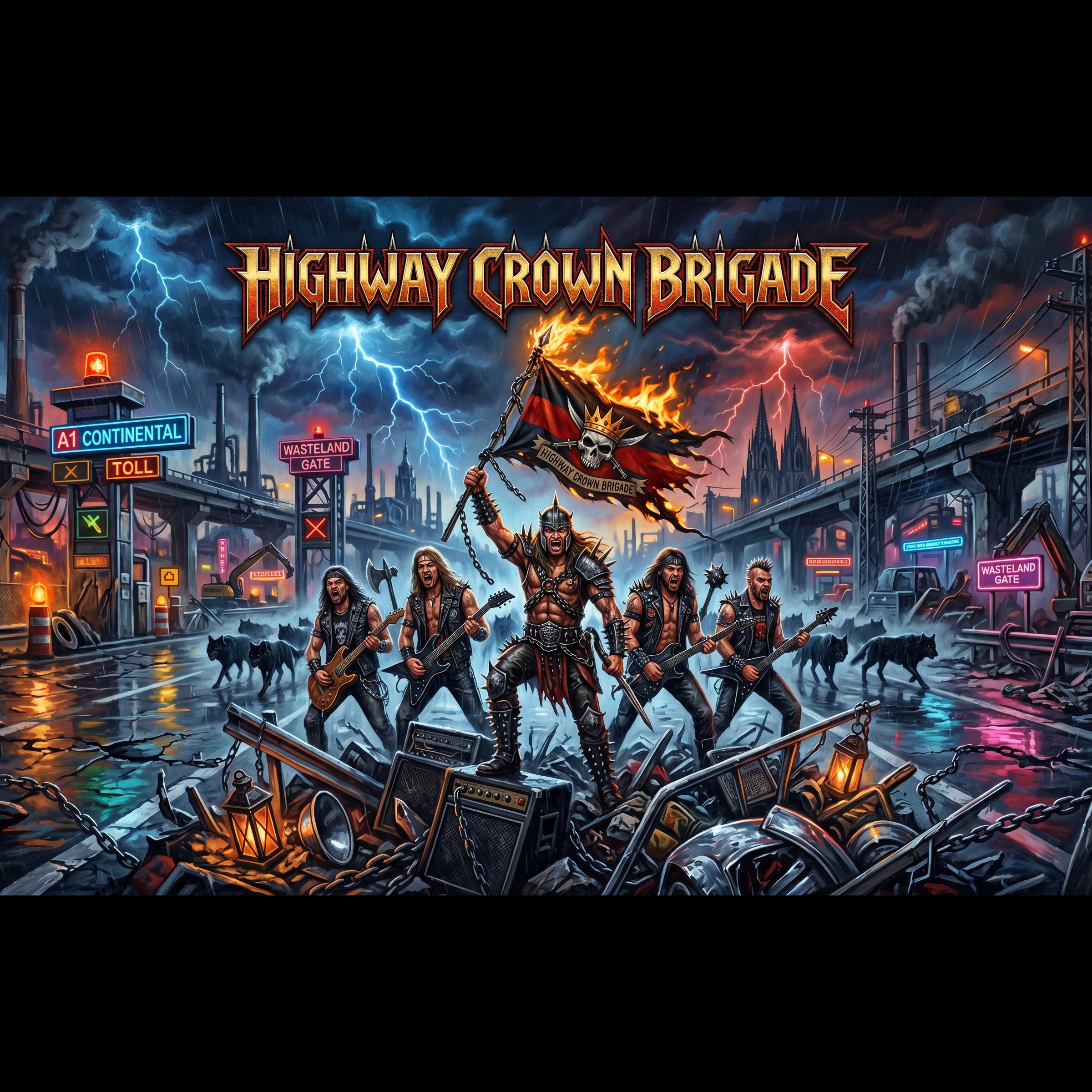 European underground heavy/speed metal from the 1990s to today, inspired by obscure but vibrant continental steel without copying any single band, Title: Highway Crown Brigade, Key: C minor, Tempo: 155 BPM, Use tight 4/4 drums, galloping rhythm guitars, twin-lead harmonies, melodic bass that stays clearly audible, and an analog-grit mix, Vocals: forceful male tenor with grit, urgency, and anthemic chorus lift, Mood: continental highway heavy metal, neon rain, chrome reflections, tollgate towers, leather brotherhood, border roads, wolves, ritual fire, and outlaw devotion, Arrangement: tense intro, riff-heavy verse, rising pre-chorus, explosive chorus, second verse, bridge, melodic solo, final double chorus, defiant outro, Dark, vivid, heroic, underground, faithful to true European metal spirit