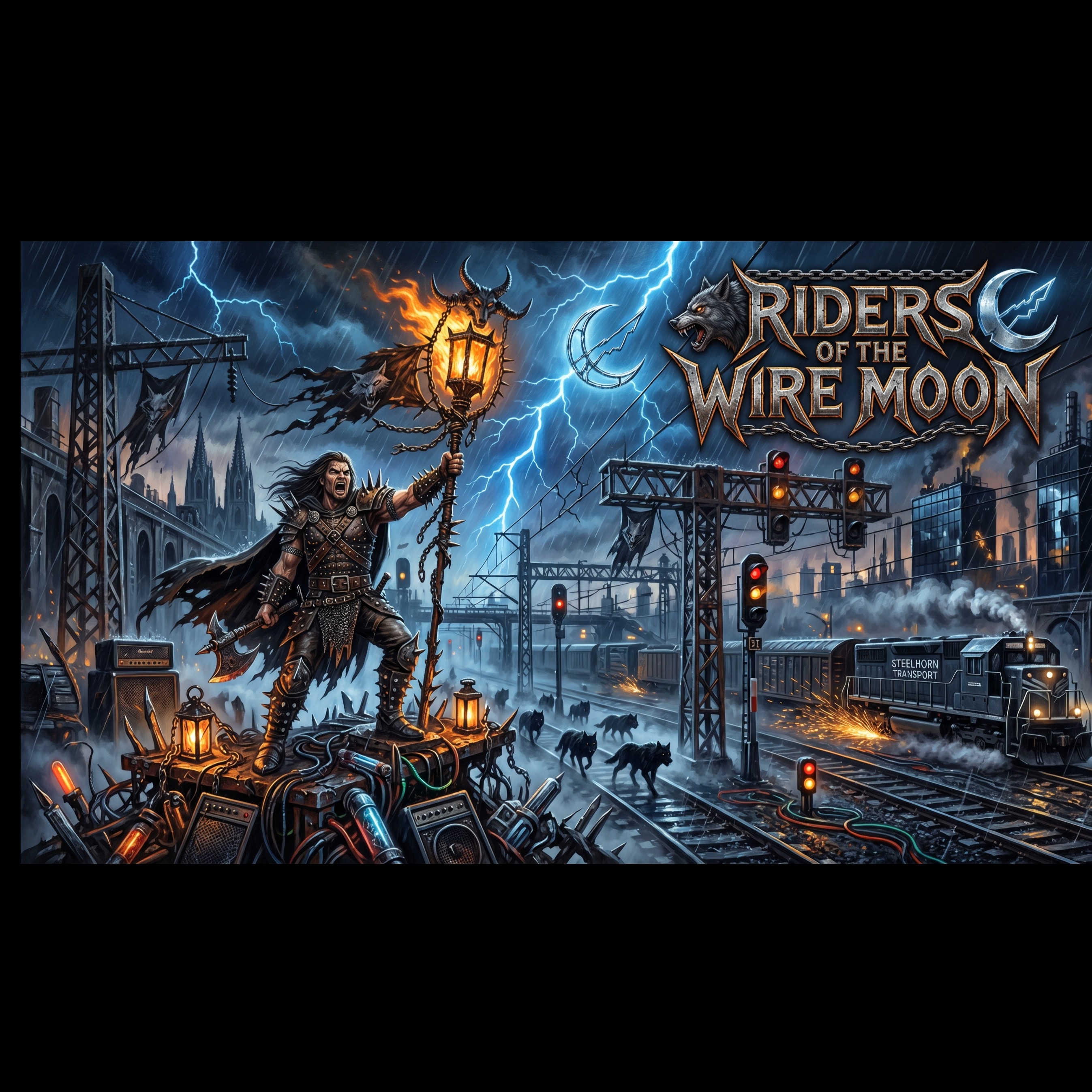 European underground heavy/speed metal from the 1990s to today, inspired by obscure but vibrant continental steel without copying any single band, Title: Riders of the Wire Moon, Key: A minor, Tempo: 160 BPM, Use tight 4/4 drums, galloping rhythm guitars, twin-lead harmonies, melodic bass that stays clearly audible, and a sharp analog-grit mix, Vocals: forceful male tenor with grit, urgency, and anthemic chorus lift, Mood: rail border midnight metal, wire moon, signal towers, chrome rain, wolves, storm highways, freight sparks, ritual fire, and outlaw devotion, Arrangement: tense intro, riff-heavy verse, rising pre-chorus, explosive chorus, second verse, bridge, melodic solo, final double chorus, defiant outro, Dark, vivid, fast heroic, underground, faithful to European metal spirit, Alive